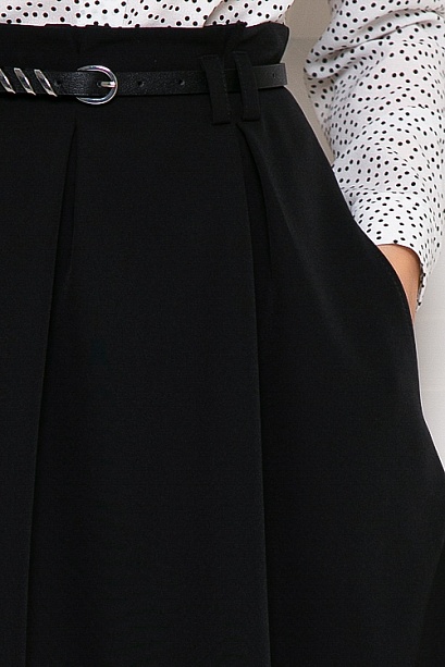 Юбка из костюмной ткани с тремя встречными складками по переду и по спинке.Застежка молния в среднем шве спинки,в боковых швах функциональные карманы.По поясу шлевки,ремень в комплект не входит.