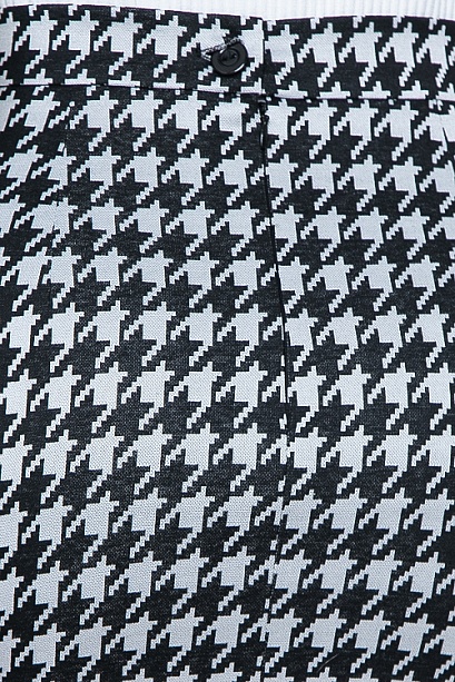 Юбка из жаккардового трикотажного полотна гусиная лапка.В среднем шве спинки застежка молния.Изделие на притачном поясе с застежкой на пуговицу сзади.