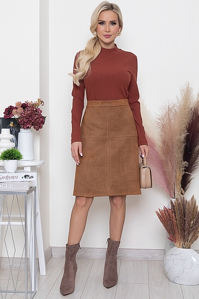Юбка трапеция из искусственной замши на притачном поясе и застежкой в среднем шве спинки на пуговицу и потайную молнию.