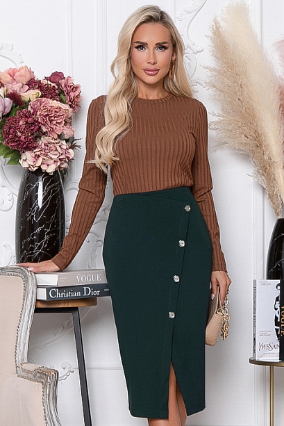 Юбка из трикотажного полотна джерси с имитацией запаха и декоративными пуговицами,в среднем шве спинки застежка молния.