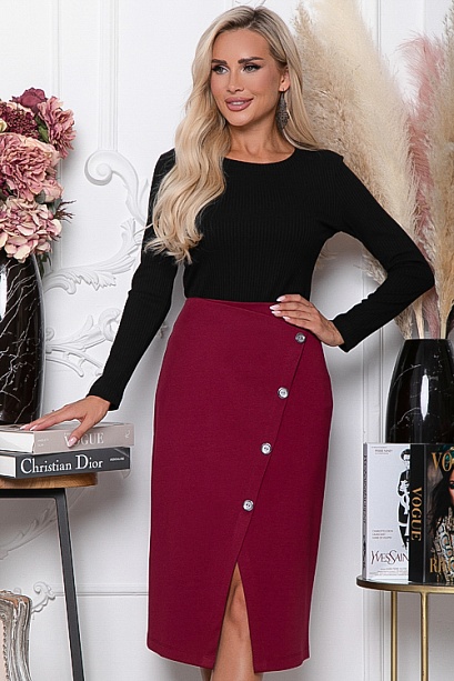 Юбка из трикотажного полотна джерси с имитацией запаха и декоративными пуговицами,в среднем шве спинки застежка молния.