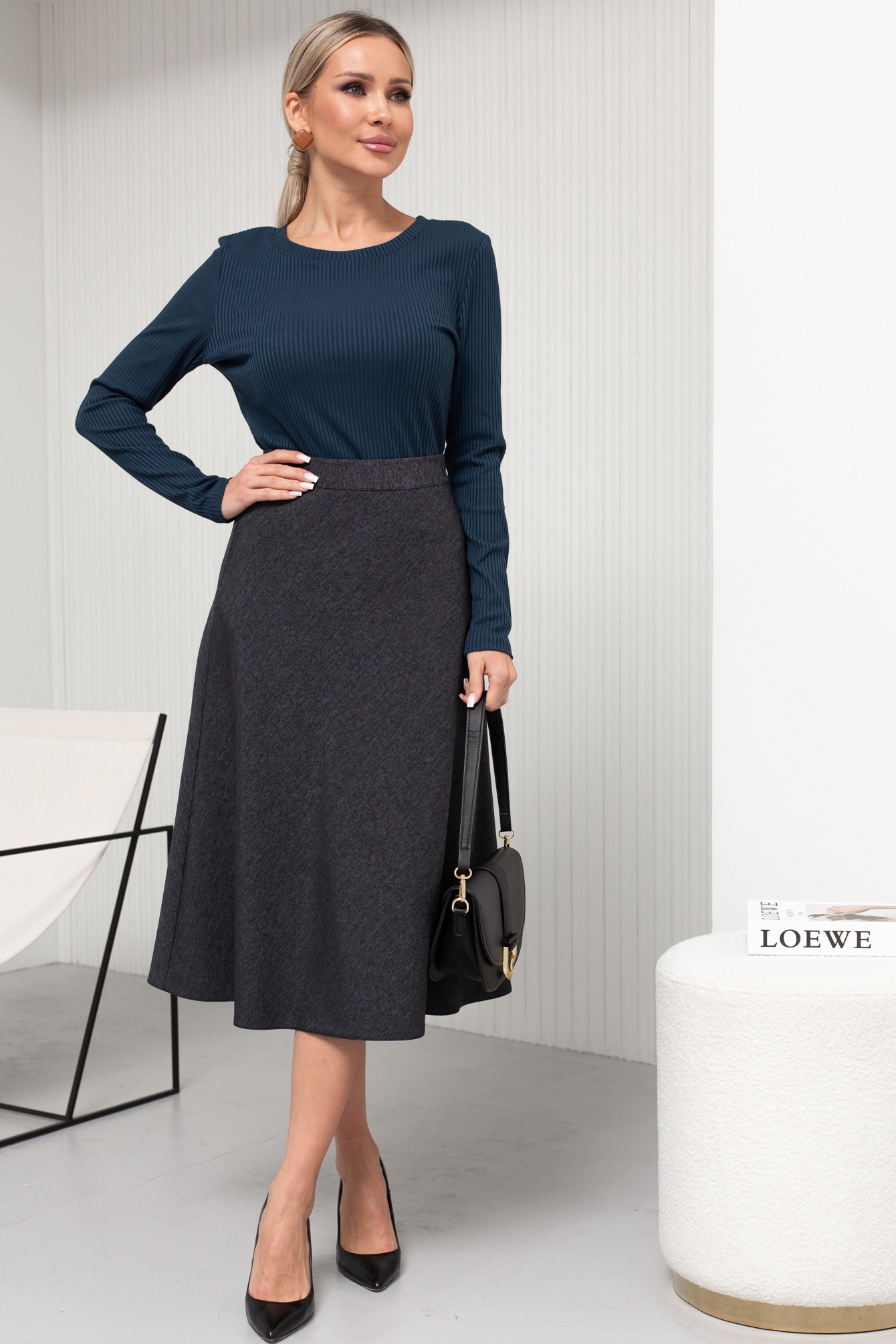 Стильная расклешенная юбка. Верх дополнен втачным поясом. Застежка на пуговицу и потайную молнию расположена в боковом шве. Подол прямой, без разрезов. Благодаря своему крою, юбка прекрасно скрывает недостатки в области бедер.