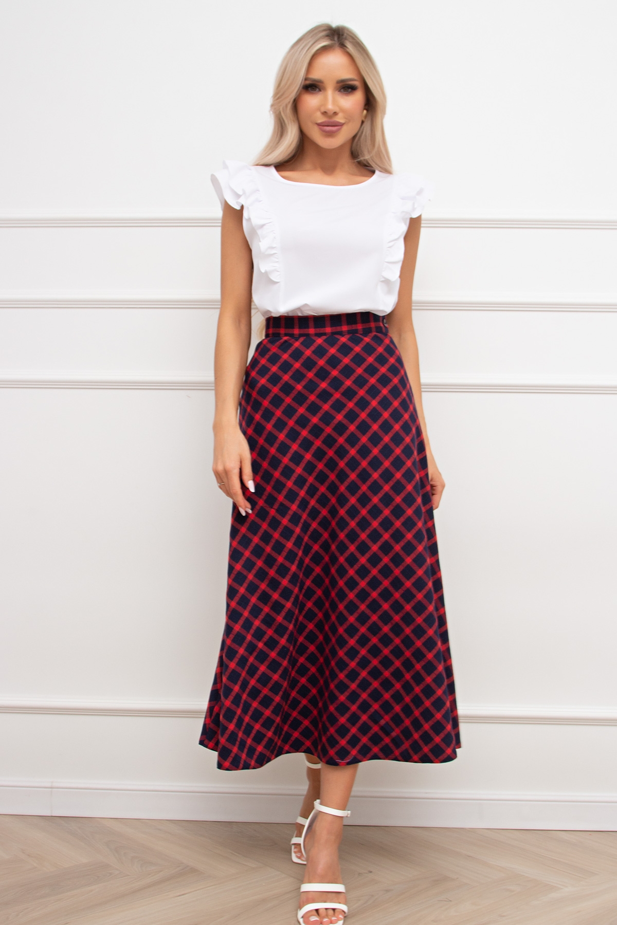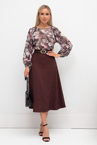 Стильная расклешенная юбка. Верх дополнен втачным поясом. Застежка на пуговицу и потайную молнию расположена в боковом шве. Подол прямой, без разрезов. Благодаря своему крою, юбка прекрасно скрывает недостатки в области бедер.