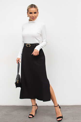 Элегантная юбка из плательно - костюмной ткани с комфортной посадкой на талии. Верх талии на внутренней обтачке. Сзади застежка на потайную молнию. Двойной перед дополнен глубоким разрезом в рельефном шве. Низ ровный.