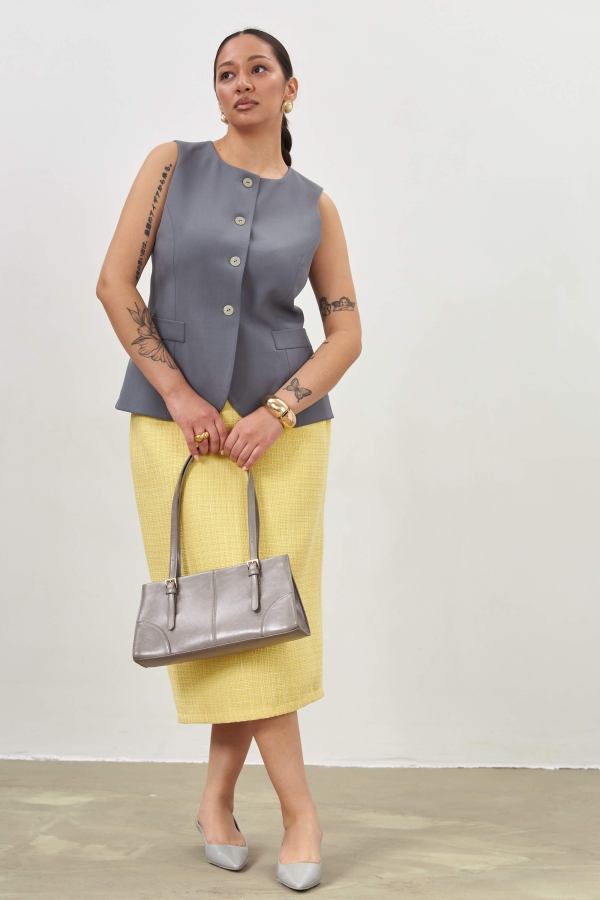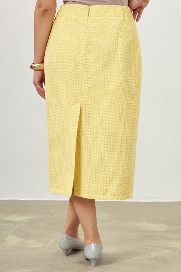 Юбка миди прямого силуэта, на поясе комфортная резинка для лучшей посадки, застежка на потайную молнию, шлица на спинке. Изделие на подкладе.