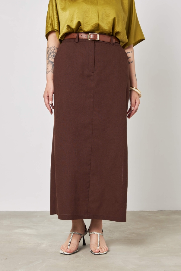 Юбка-трапеция длины макси с поясом на резинке. Застежка на пуговицу и молнию, по переду боковые карманы.