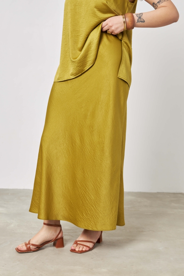 Юбка макси из крэш сатина, силуэт годе, с цельнокроеным поясом на резинке.
