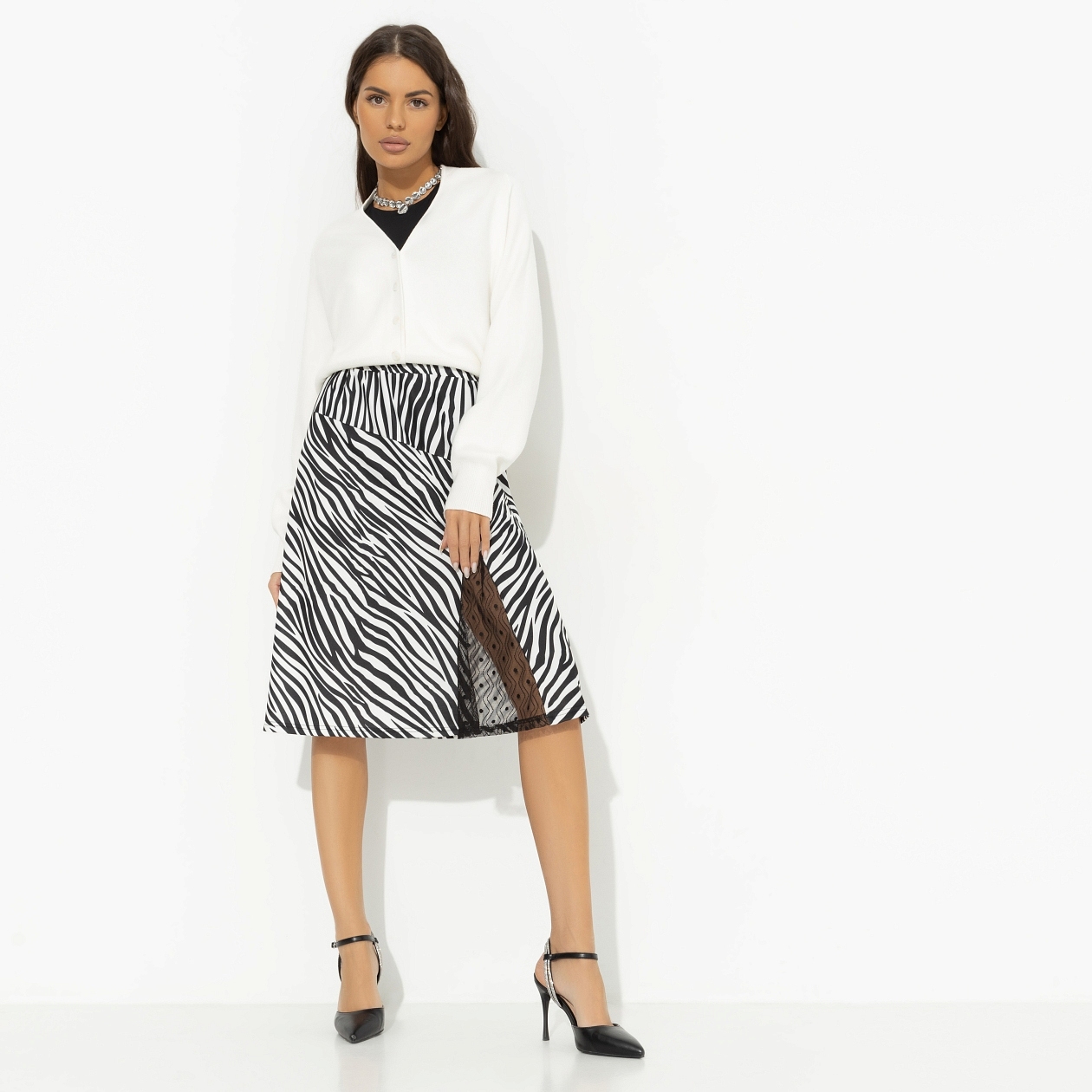Снова на вершине модных трендов! Зебра бьет все рекорды. Анималистичный принт так полюбился модницам, что возвращается вновь и вновь. Модные аналитики призывают – инвестируйте выгодно. Юбка расклешенного силуэта в длине до колена. Разрез оформлен тонким кружевом. Посадка изделия на талии. Пояс оформлен скрытой резинкой.