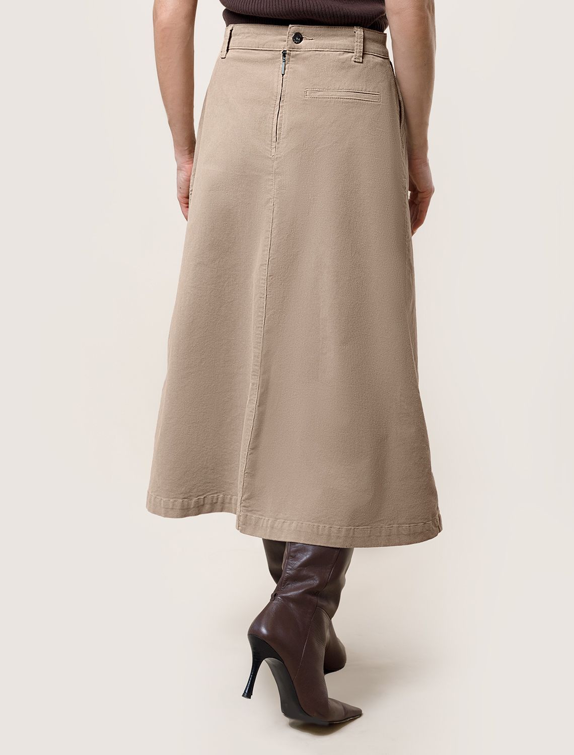 Юбка-миди трапециевидного силуэта выполнена из мягкого хлопкового микро-вельвета с добавлением эластана. Изделие комфортно садится по фигуре и не сковывает движения. Модель дополнена высококачественной фурнитурой с фирменным логотипом бренда. Хорошо комбинируется с вязаным трикотажем, блузками и денимом.Также прекрасно станет альтернативой деловым низам в нестрогом офисном дресс-коде.