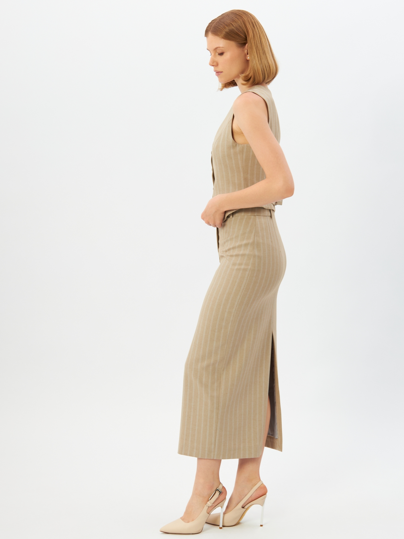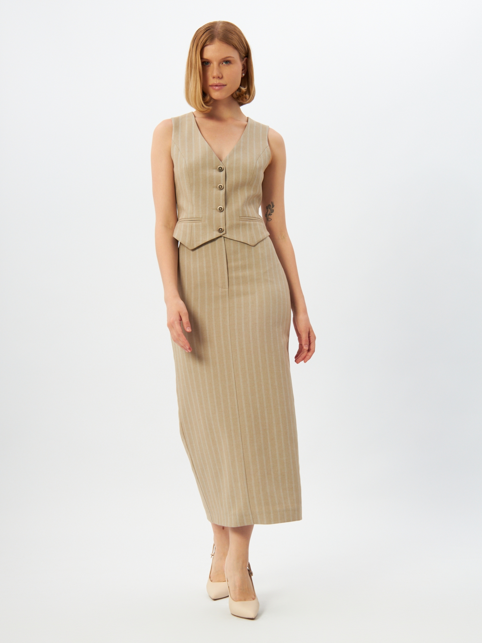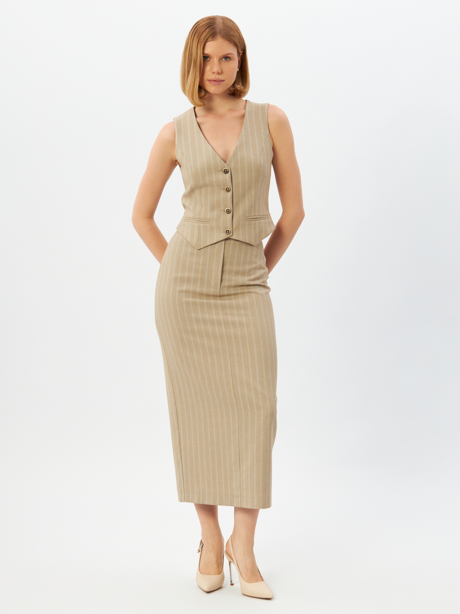 Представляем стильную юбку из костюмной ткани в полоску, выполненную в благородном цвете капучино. Эта модель — идеальное решение для формирования базового гардероба вашей торговой точки, гарантирующее высокий спрос среди оптовых закупщиков и владельцев бутиков.