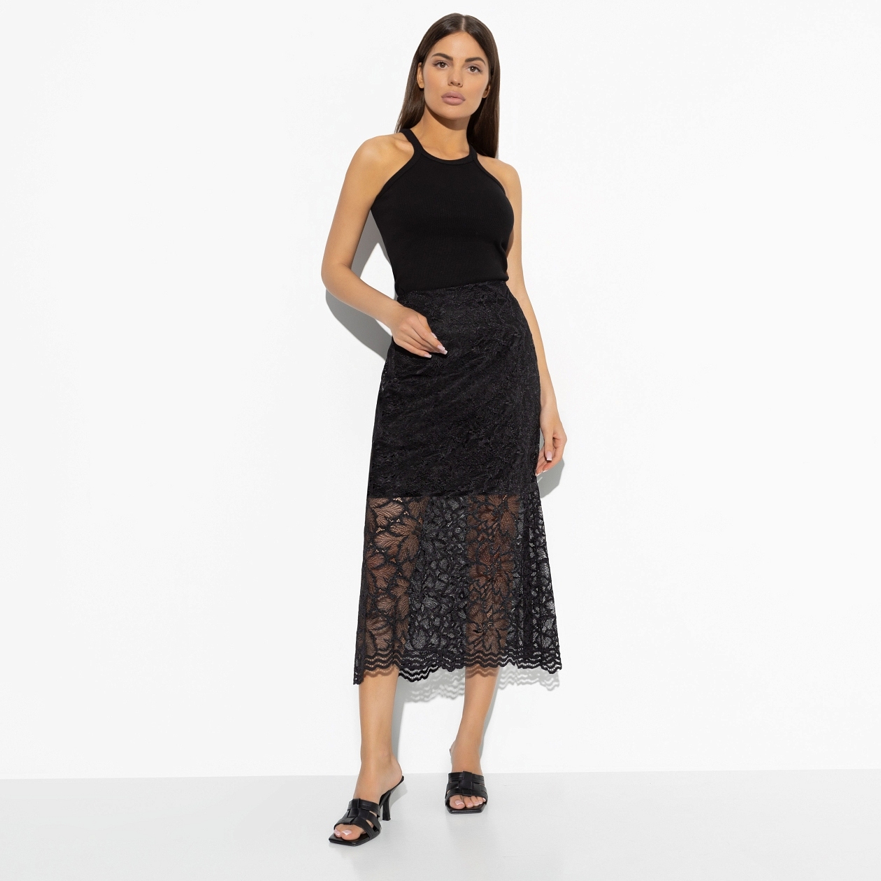 Предлагаем поднять бокалы за то, что женственность стала горячим трендом. Кружевная юбка на пике популярности. Изящное заигрывание с миром маскулинности, где победа будет однозначно на вашей стороне. Юбка из кружева в длине миди. Чуть расклешена к низу. Есть подклад. Юбка застегивается на скрытую молнию по задней части изделия.