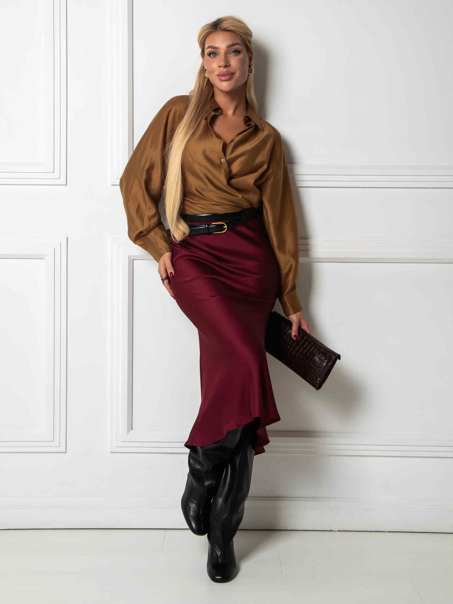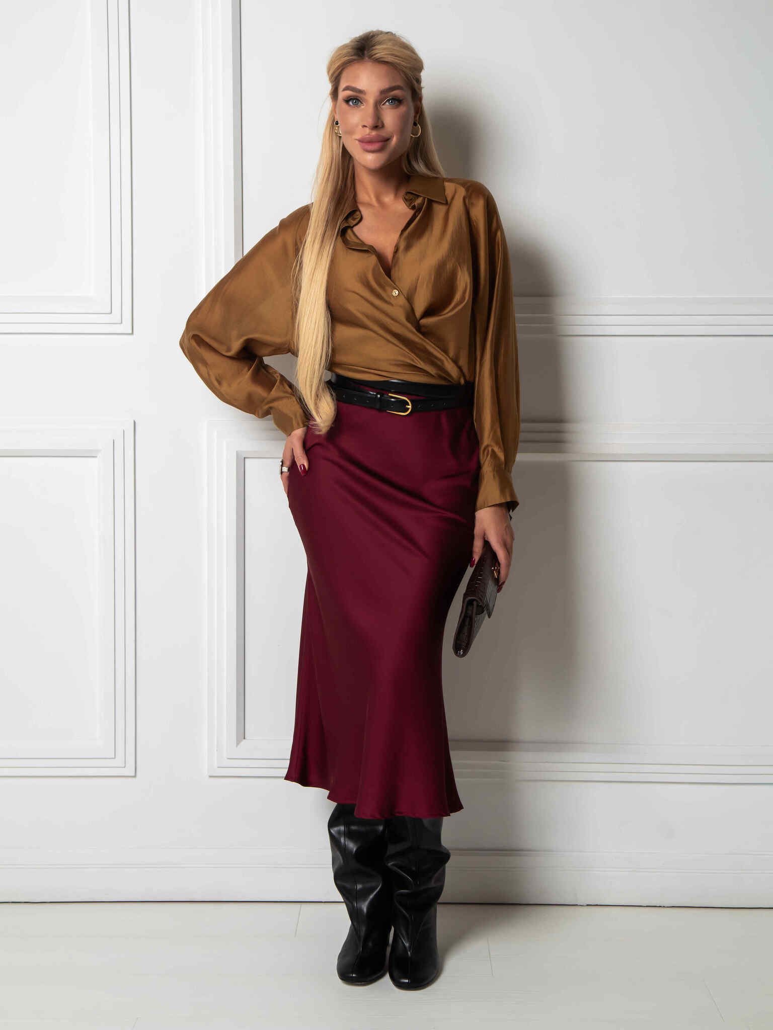 Юбка миди А- силуэта из дубайского шелка с потайным эластичным поясом, легким глянцевым блеском. Юбка хороша в комплектах разного стиля и украшает любой тип фигуры.