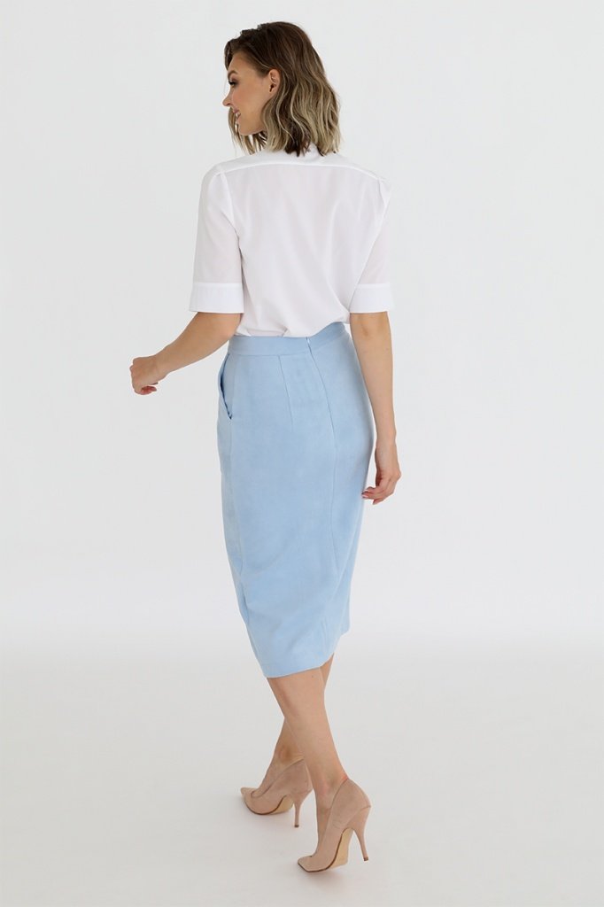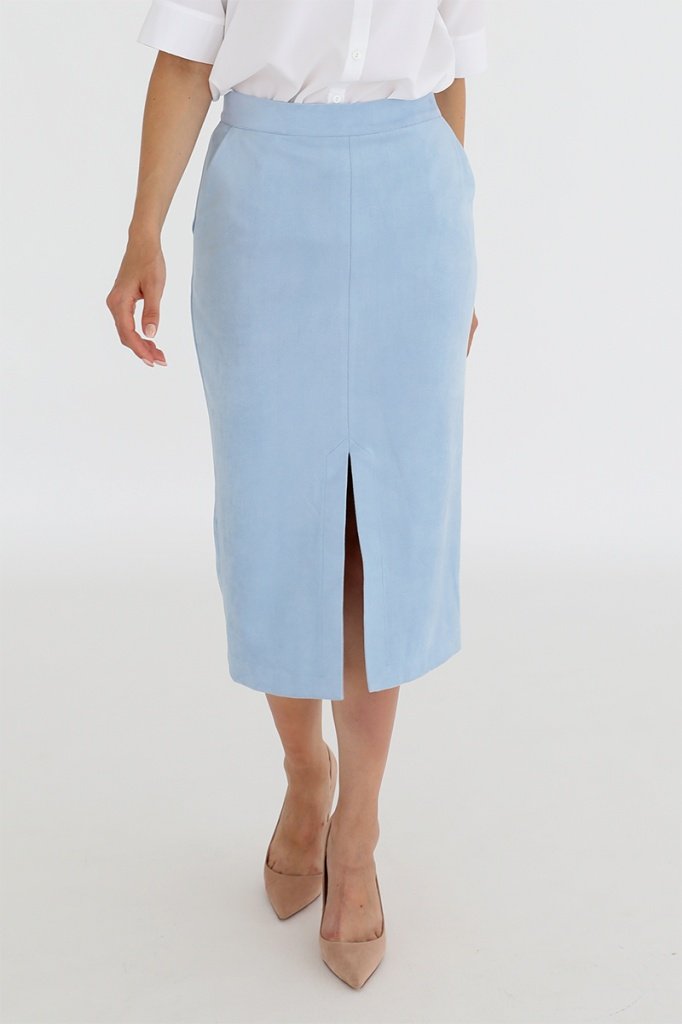 Юбка-карандаш с разрезом по переду, карманами в боковых швах, притачным поясом и застежкой на потайную молнию в среднем шве спинки.