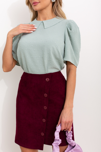 Юбка мини. По переду планка - имитация запаха, декорированная пуговицами. По спинке застежка на потайную молнию. Верх на внутренней обтачке. Низ без разрезов.
