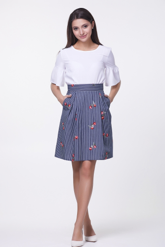 Стильная и удобная юбка на притачном поясе из натуральной ткани с цветочным узором. По переднему полотну заложены мягкие встречные складки. По бокам карманы. Сзади находится застежка на пуговицу и потайную ленту-молнию. Подол ровный, без разрезов. Модель идеально подойдет для создания делового образа.