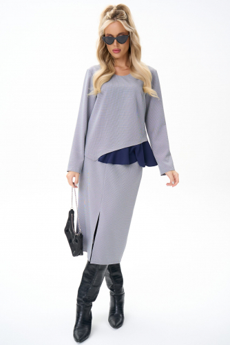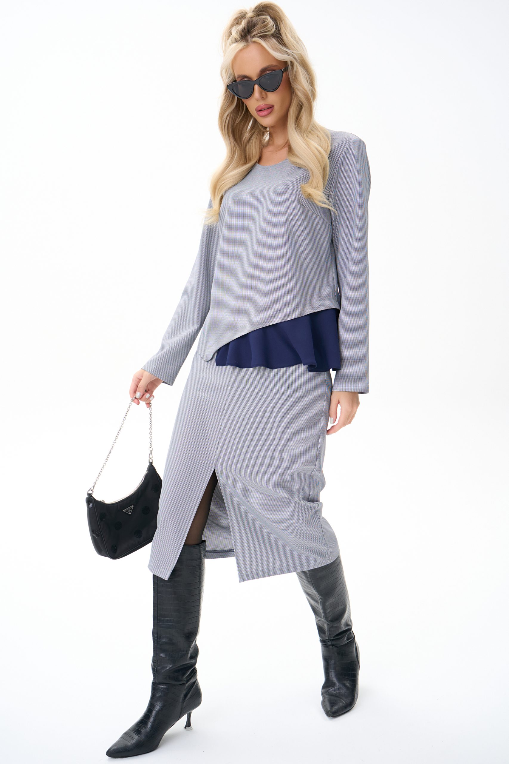 Элегантный костюм, сочетающий асимметричный блузон и прямую юбку миди. Идеальный выбор для делового образа с ноткой современности.