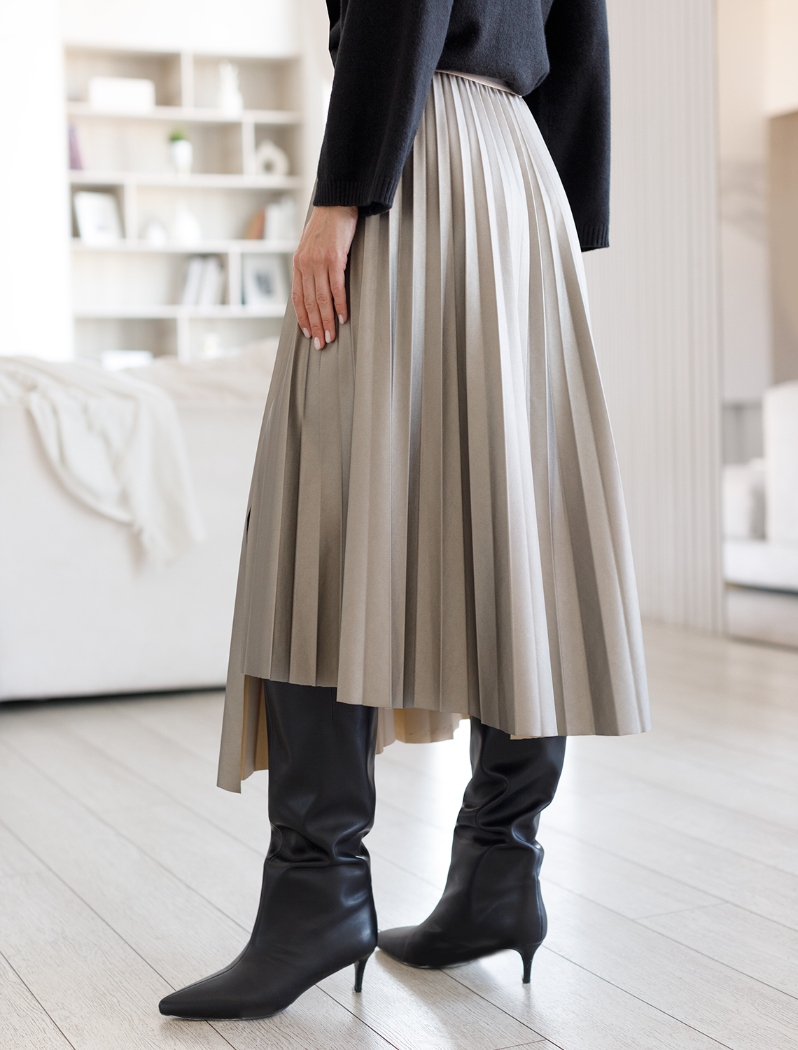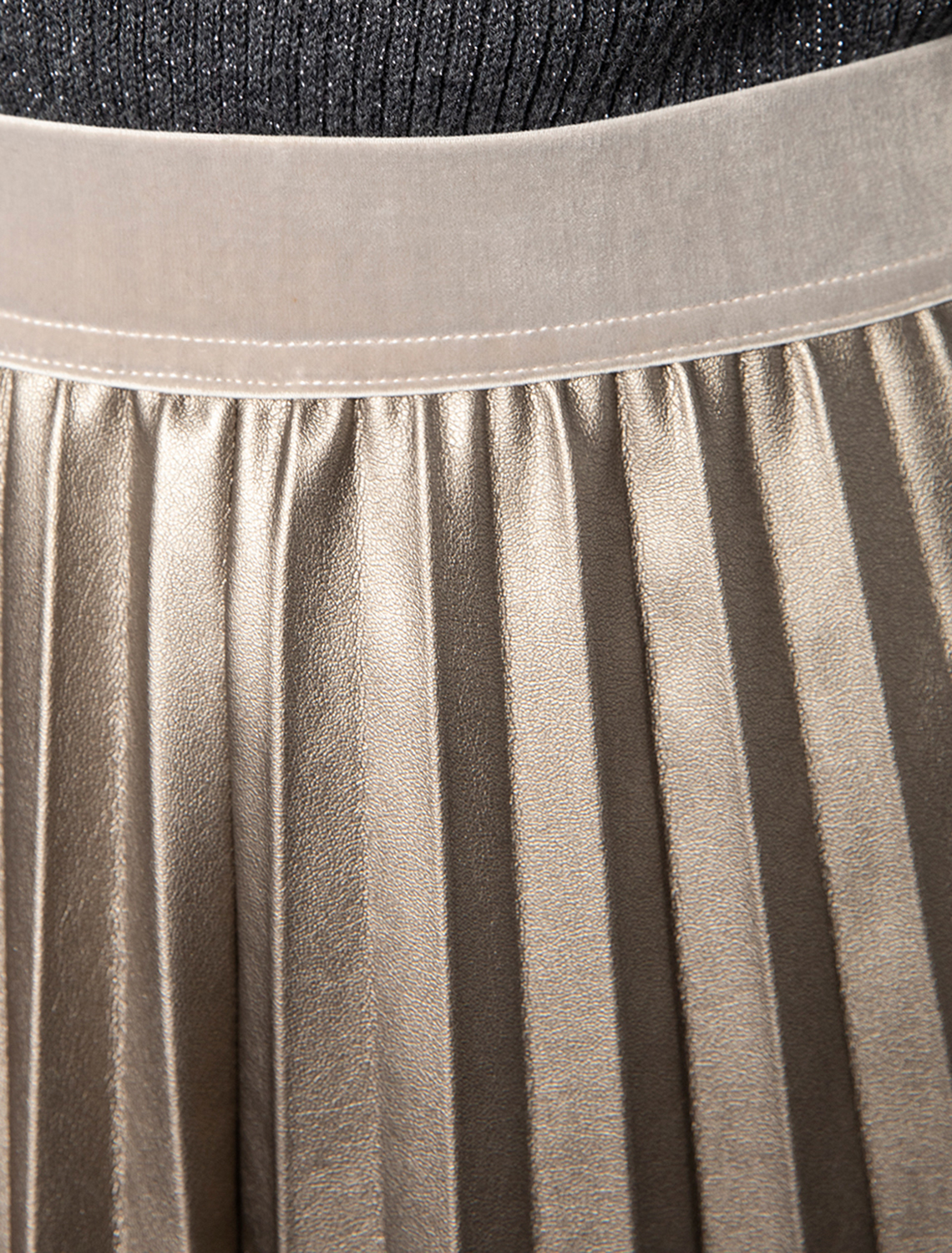 Асимметричная плиссированная юбка выполнена из мягкой эко-кожи. Посадка на талии акцентирована поясом из эластичной вельветовой ленты. Полуматовое покрытие смотрится утонченно и легко поможет создать вечерний образ, а также в повседневных образах станет отличным компаньоном к свитерам и высоким сапогам. На уровне ассиметричной линии спереди находится разрез, открывающий ноги. Атласное внутреннее покрытие обеспечивает идеальный комфорт при носке с колготками.