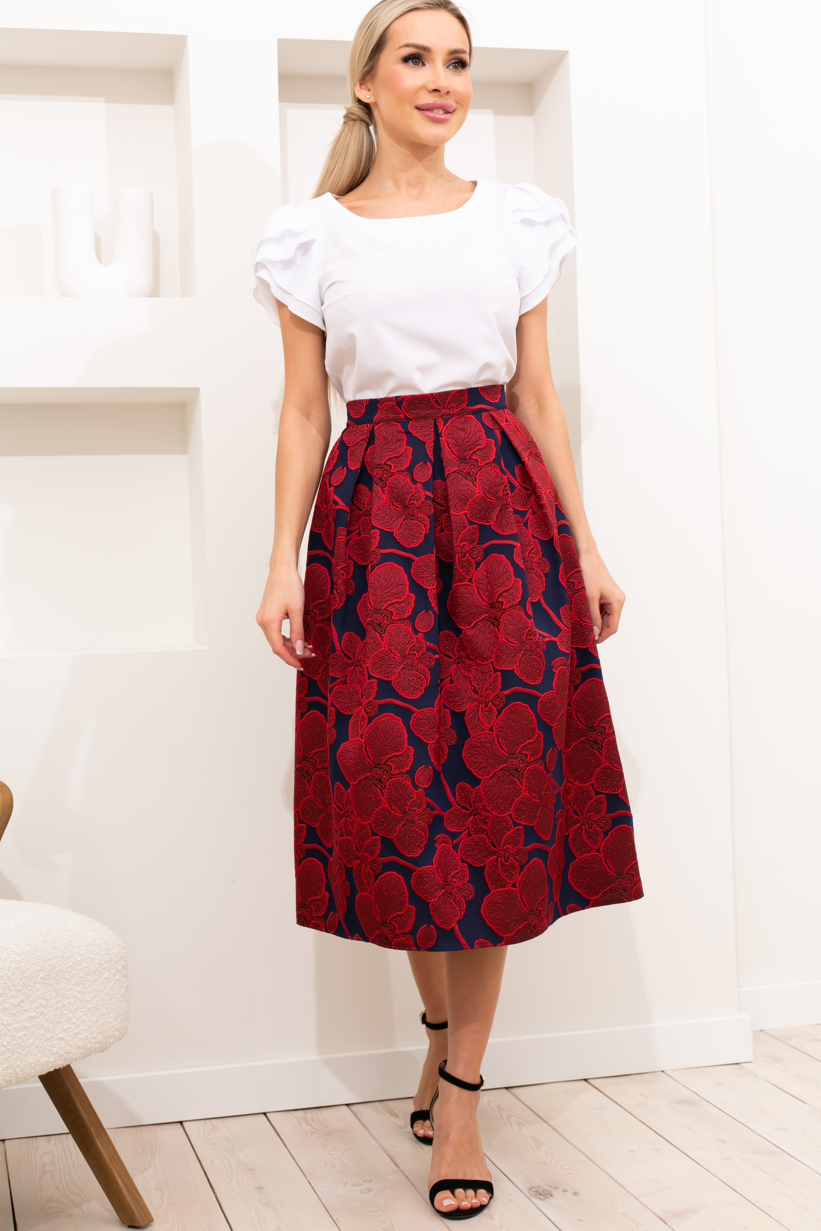 Эффектная юбка из жаккардового полотна с растительным узором. Верх на широком притачном поясе, дополнен встречными мягкими складками. В среднем шве спинки расположена застежка на пуговицу и потайную молнию. Низ ровный, без разрезов. Модель без подклада.