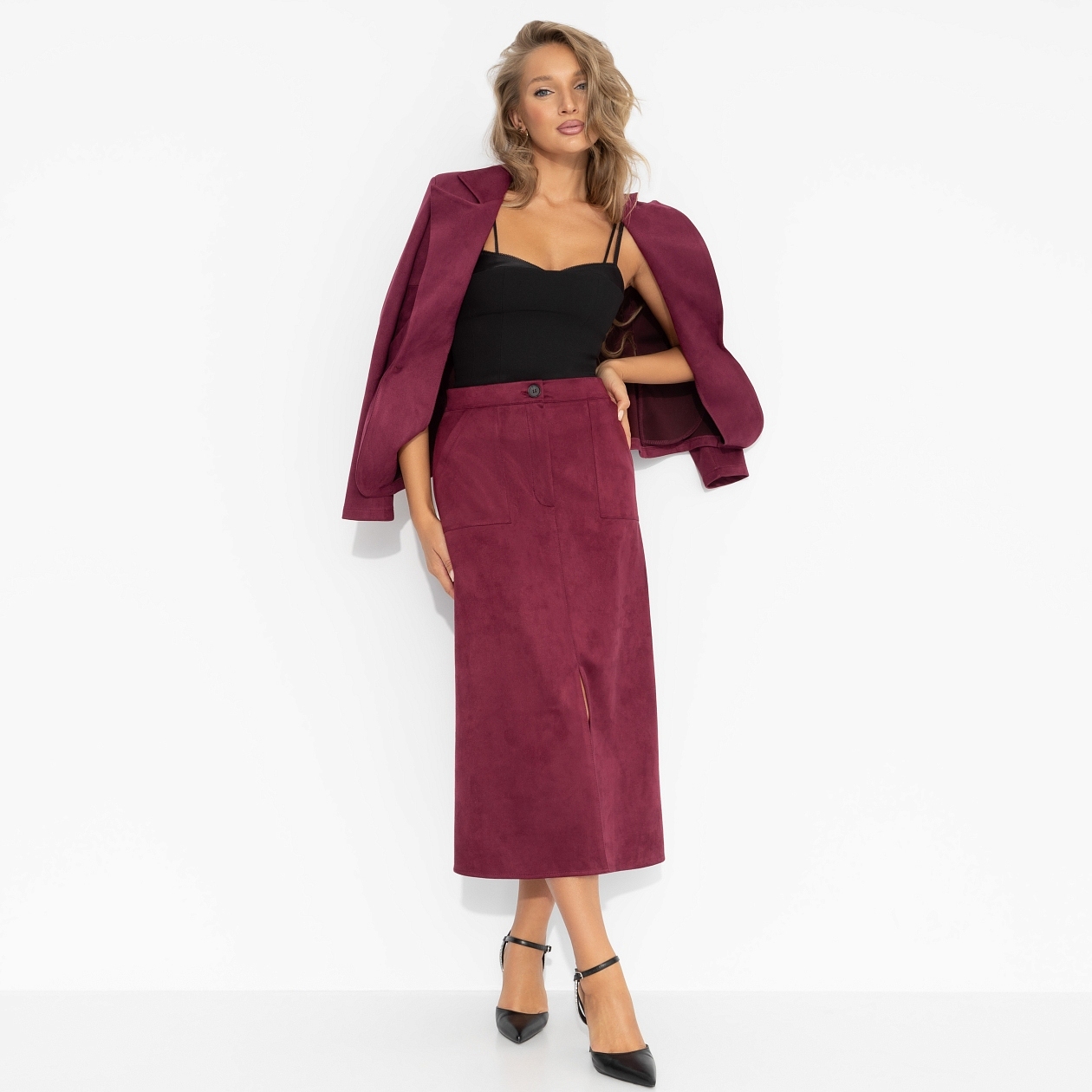 Эта юбка – как бокал красного в полдень: немного дерзости, немного утончённости. Гладкая бархатистая фактура и выверенная посадка превращают каждый шаг в важное заявление. Юбка в длине миди с карманами, застежка на пуговицу.