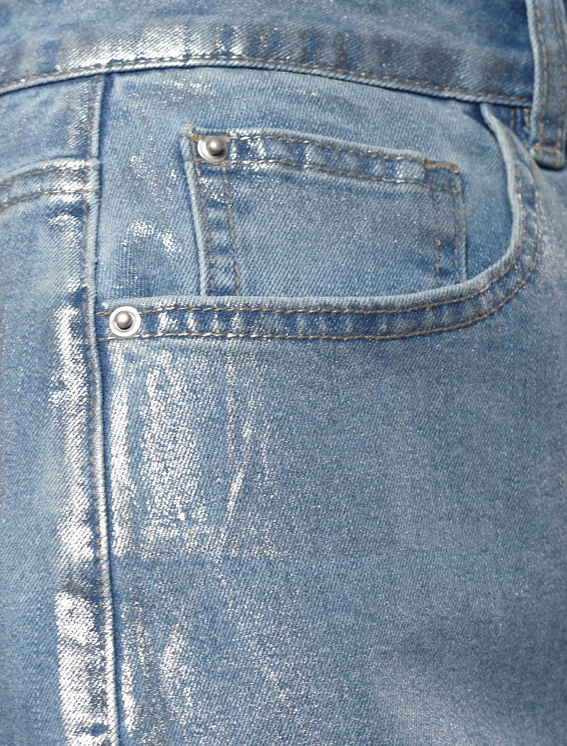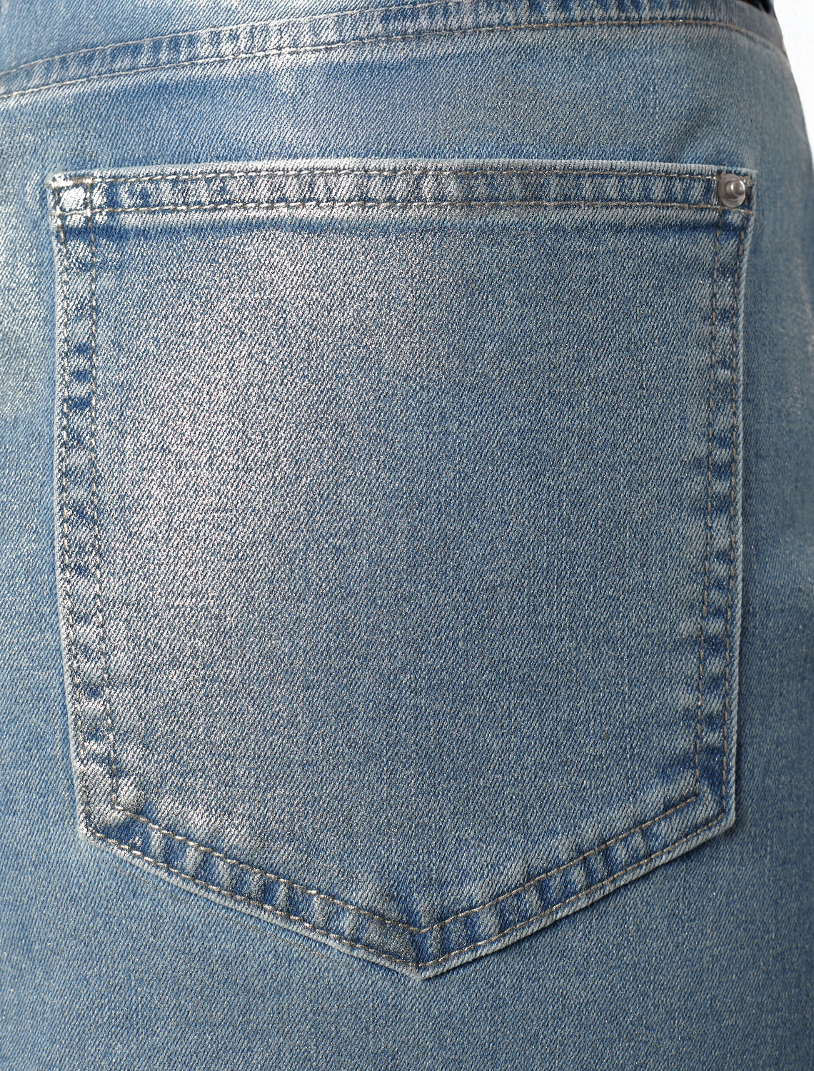 Юбка выполнена из эластичного денима. Сверху изделия нанесено стойкое, но при этом мягкое металлизированное покрытие с декоративными потёртостями. Модель прямого кроя чуть ниже колен с трендовым открытым срезом и пятью карманами как у джинс внесет яркий акцент любому образу. 70%Хлопок 28%ПЭ 2%ПУ