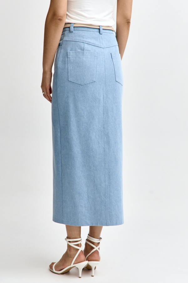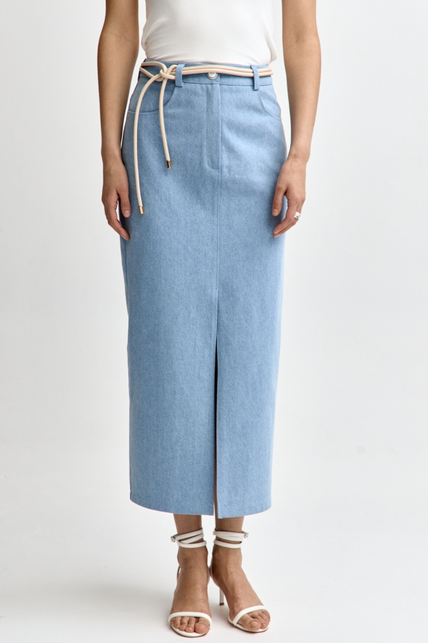 Юбка длины мидакси из джинсового полотна. Модель прямого силуэта на притачном поясе. По переду высокий разрез, боковые карманы. По спинке кокетка с накладными карманами. Застёжка-гульфик.