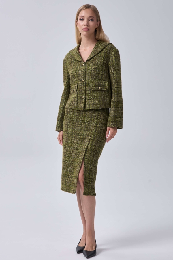 Юбка из твида с фигурным разрезом. Модель прямого силуэта на поливискозном подкладе. Средняя посадка. По переду разрез. Застежка - потайная молния. По спинке шлица. Изделие на подкладе.