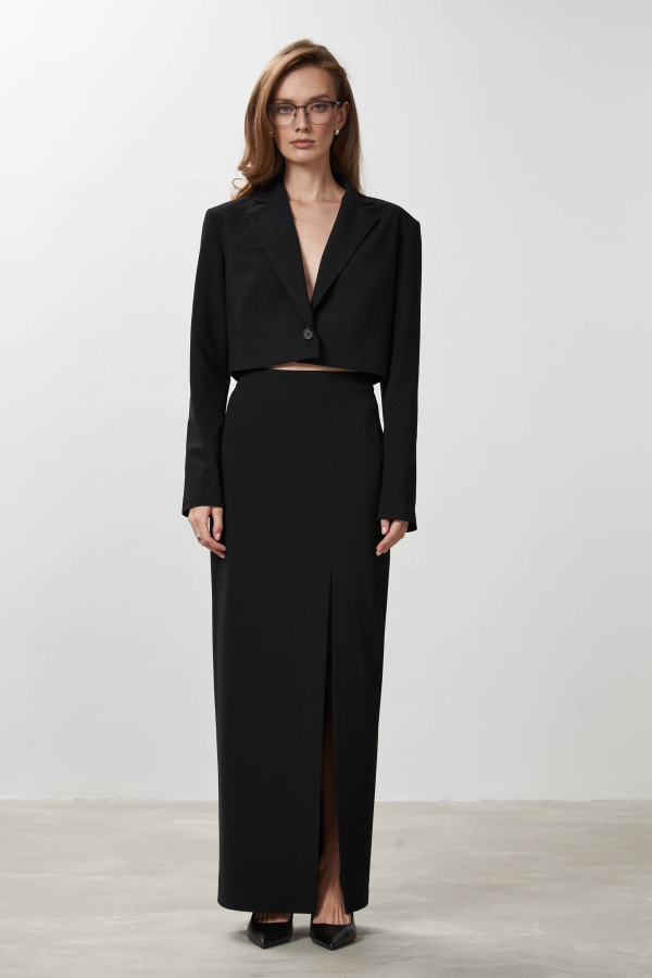 Юбка длины макси из костюмного полотна. Отрезной пояс, застёжка на потайную молнию по спинке. По переду разрез.