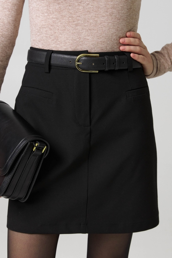 Лаконичная мини-юбка из костюмной поливискозы. Модель с легким, трапециевидным силуэтом. По переду декоративные листочки, средний шов, застежка-гульфик. Пояс со шлевками.