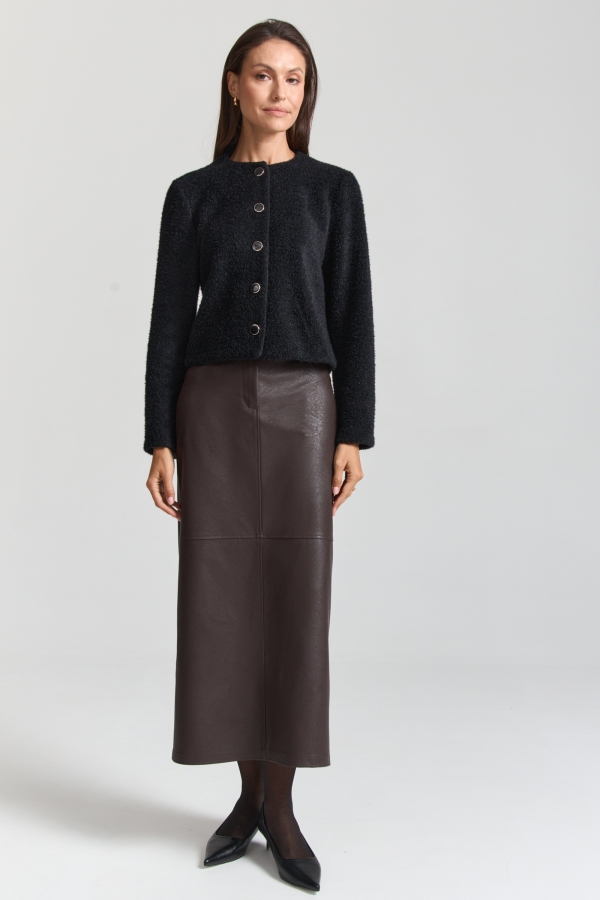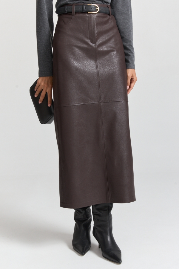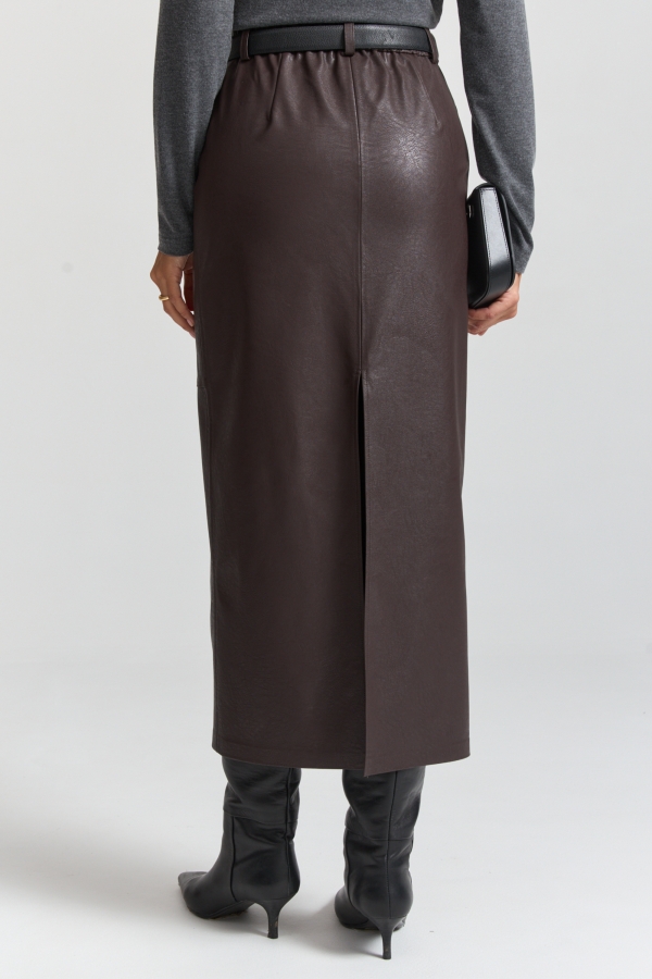 Юбка из фактурной эко-кожи в актуальном оттенке. Модель прямого силуэта на притачном поясе со шлевками. По переду имитация карманов, и застёжка-гульфик. По спинке резинка для комфортной посадки. Декоративные