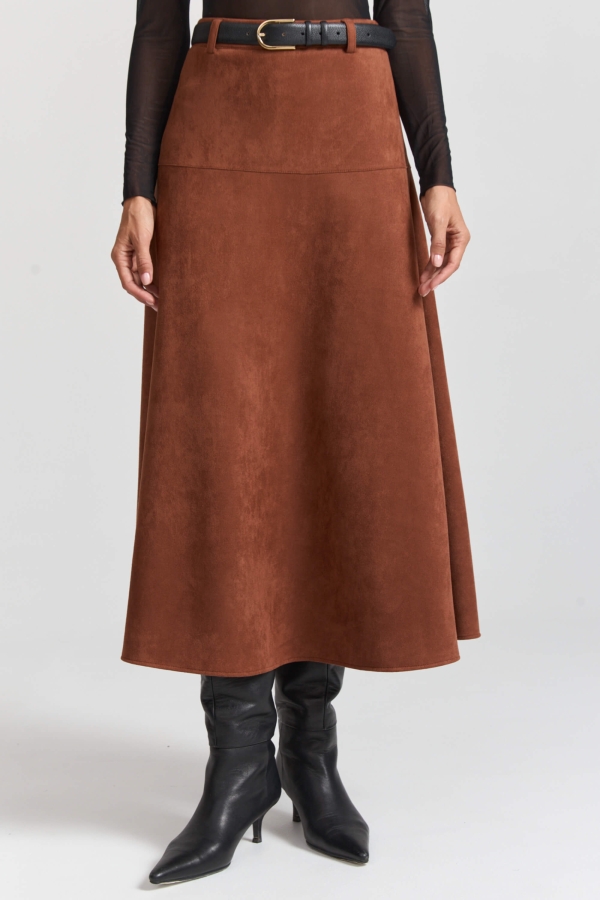 Женственная юбка из эко замши в ретро стиле. Юбка А-силуэта с притачным поясом и отрезной кокеткой + шлевки, застежка на потайную молнию в боковом шве.