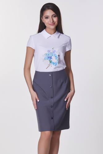 Стильная прямая юбка из однотонного костюмного полотна. Верх юбки на обтачке. По переду выполнена имитация застежки на пуговицы. В среднем шве спинки заложена застежка на потайную молнию. Модель на подкладе. Низ ровный, без разрезов.