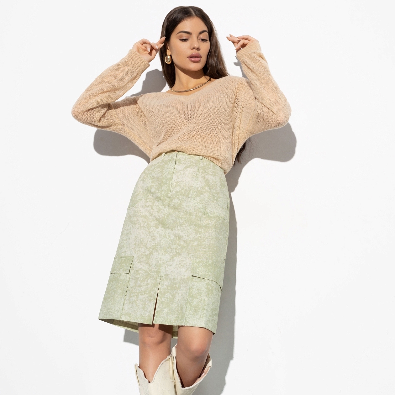 Если выбирать самую модную вещь лета, это точно будет юбка! Тем более, такая. Три супертренда: карго, накладные карманы и длина до колена. Можешь сделать образ строгим или добавить капельку нежности.