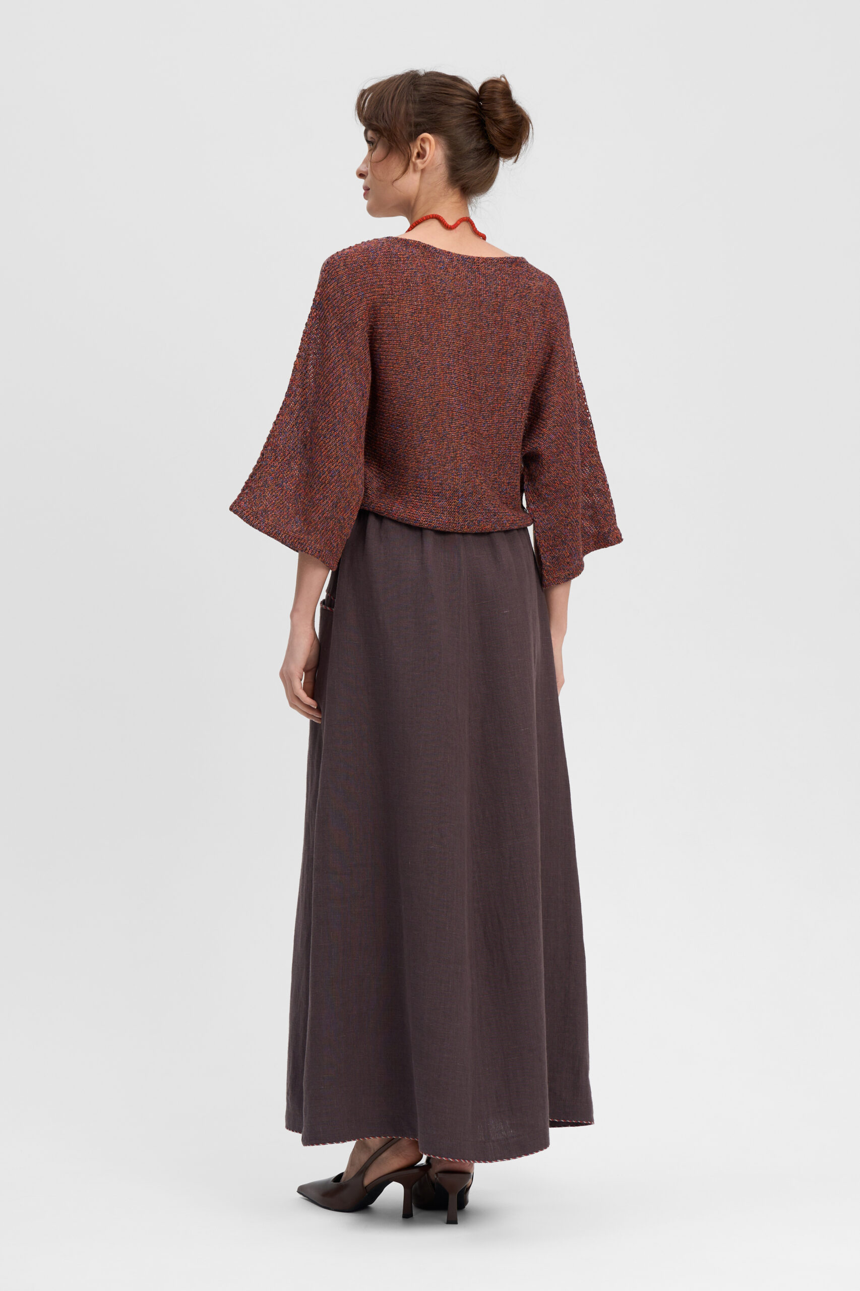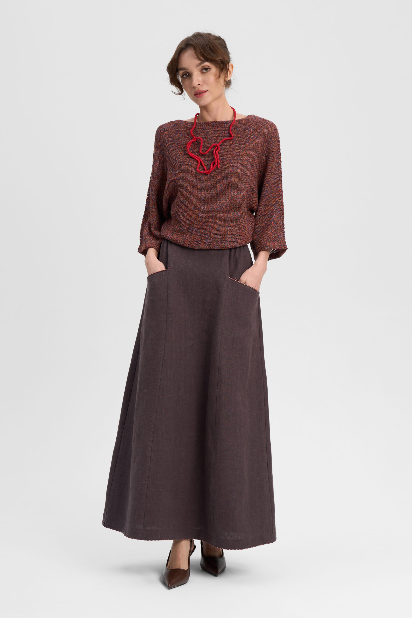 Юбка длинная с рельефами расширенная к низу. Отрезные карманы и низ декорированы шнуром. Пояс цельнокроеный на резинке.