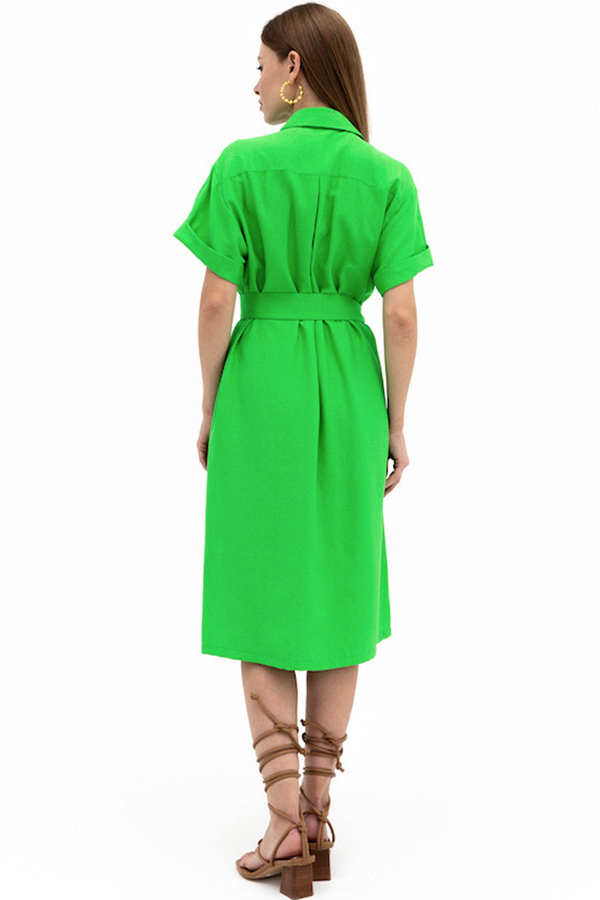 Платье -рубашка из вискозной ткани с крэш-эффектом. Свободный силуэт с застёжкой на планке. Вырез горловины обработан отложным воротником на стойке. Короткий рубашечный рукав с отворотом. На задней части изделия выполнена кокетка с небольшой складкой. На передней-накладной карман в области груди. В комплекте пояс из основной ткани.