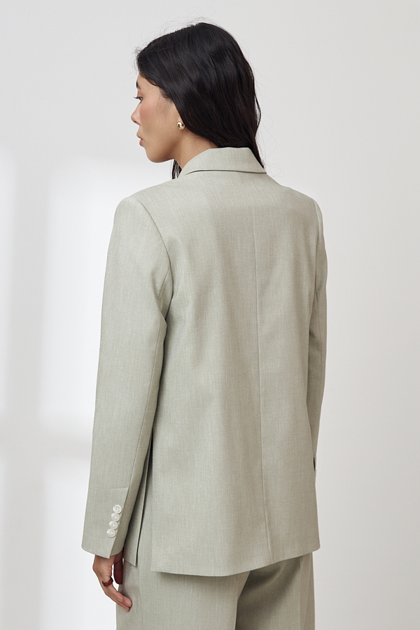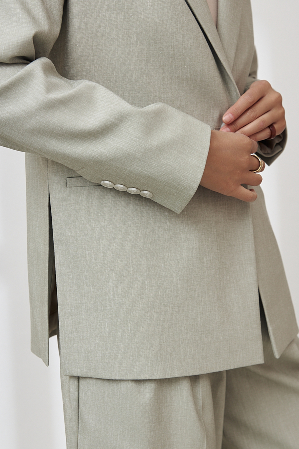 Жакет прямого силуэта с разрезами в боковых швах из меланжевой костюмной ткани. Изделие с английским воротником и застежкой на пуговицу. На передней части жакета выполнен нагрудный карман с листочкой и карманы в рамку. Втачной длинный рукав, снизу шлица с пуговицами. Изделие идеально держит форму, имеет четкую линию плеча благодаря плечевым накладкам. Жакет на подкладке.