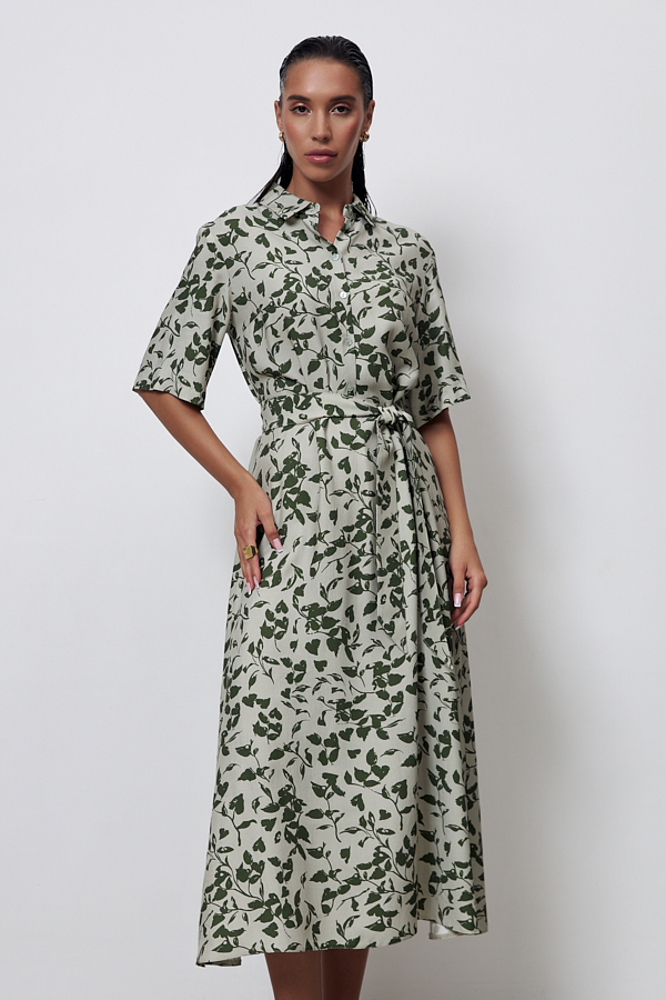 Платье полуприлегающее в области груди и свободное в области бедер из вискозной ткани. Изделие отрезное по линии талии. Лиф с застёжкой на пуговицы. Вырез горловины обработан отложным воротником на стойке. Втачной короткий рукав. В комплекте пояс из основной ткани.