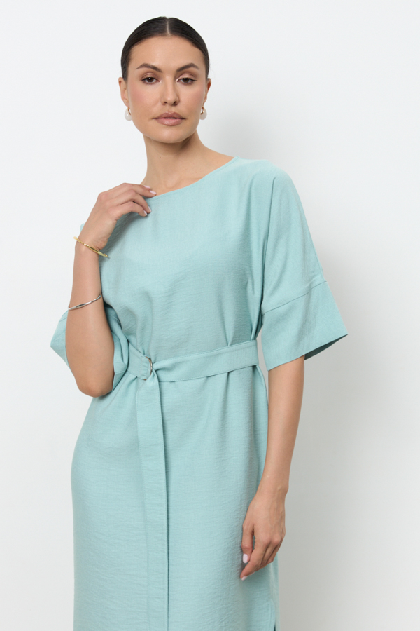 Платье из вискозной ткани с крэш-эффектом. Свободный силуэт, с разрезом в боковом шве. Круглый вырез горловины окантован косой бейкой из основной ткани. Цельнокроеный рукав с притачной манжетой. В комплекте пояс из основной ткани. В таблице размеров представлены параметры человека, а не изделия.