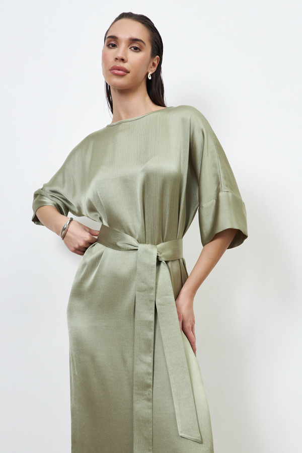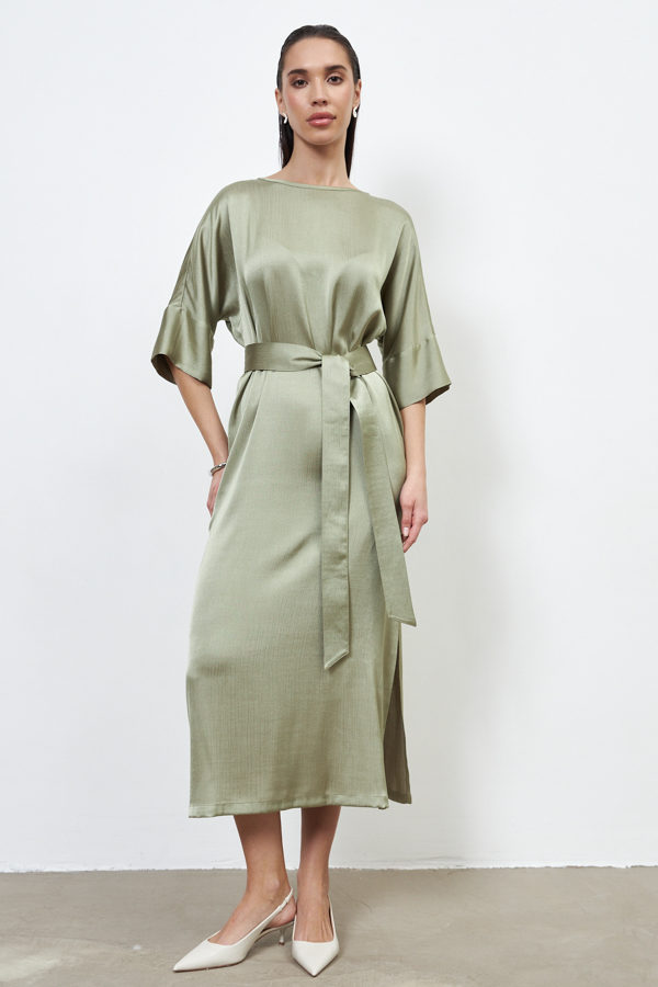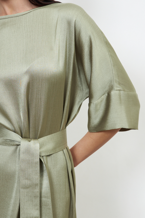Платье из вискозной ткани с крэш-эффектом. Свободный силуэт, с разрезом в боковом шве. Круглый вырез горловины окантован косой бейкой из основной ткани. Цельнокроеный рукав с притачной манжетой. В комплекте пояс из основной ткани. В таблице размеров представлены параметры человека, а не изделия.