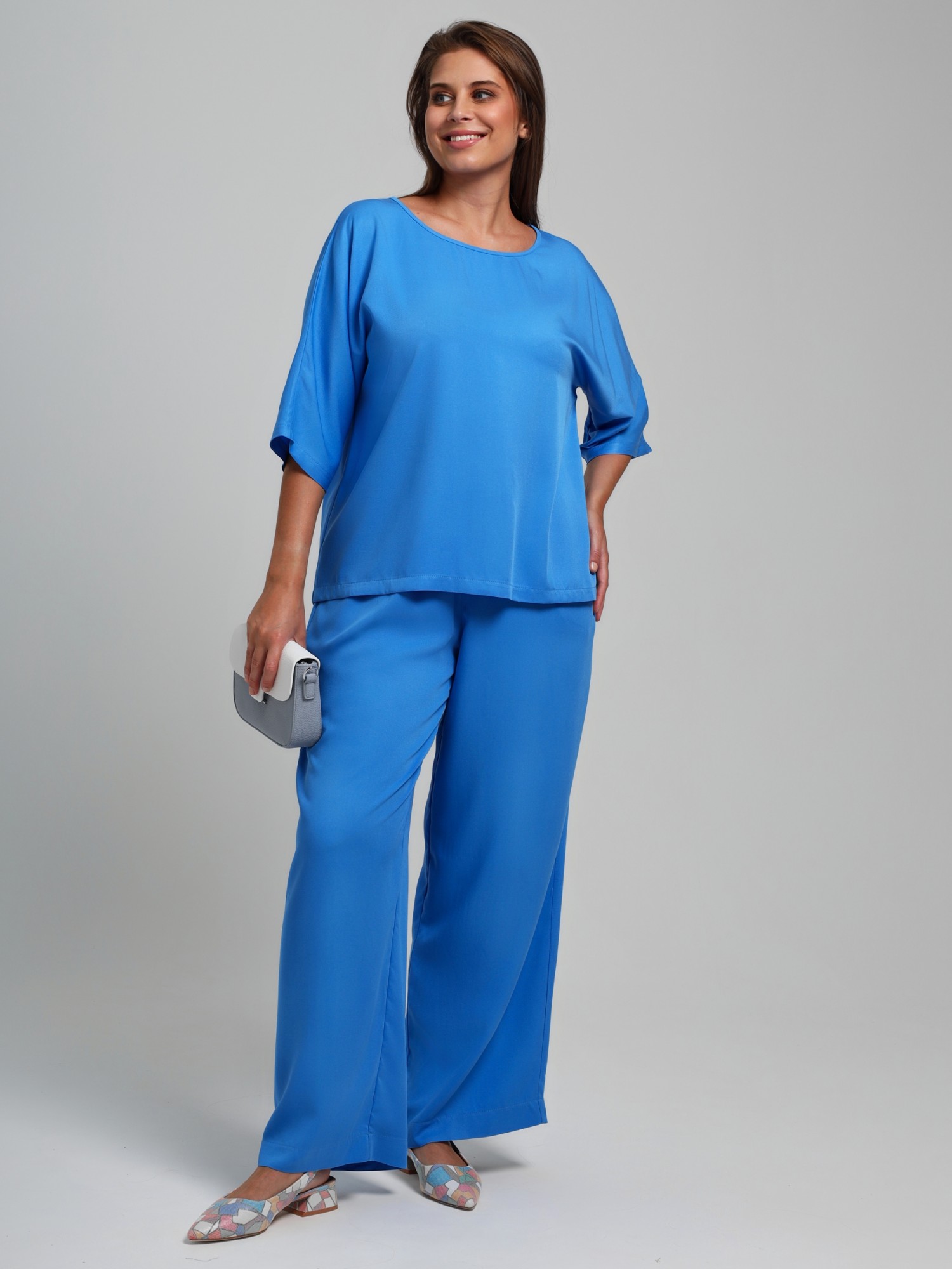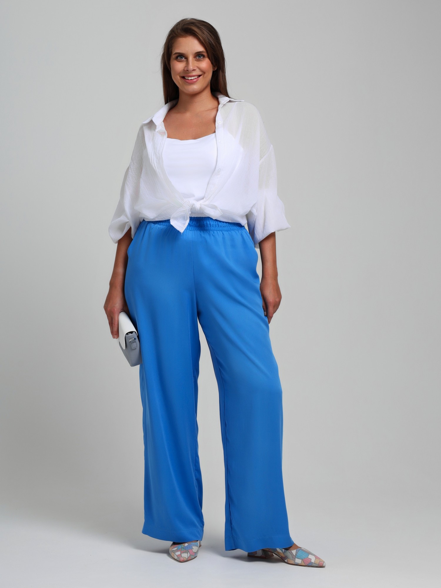 Брюки женские из гладкокрашеного тканого штапельного полотна, свободного покроя, удлиненные, с карманами в бокавых швах, на притачном поясе с эластичной тесьмой внутри.