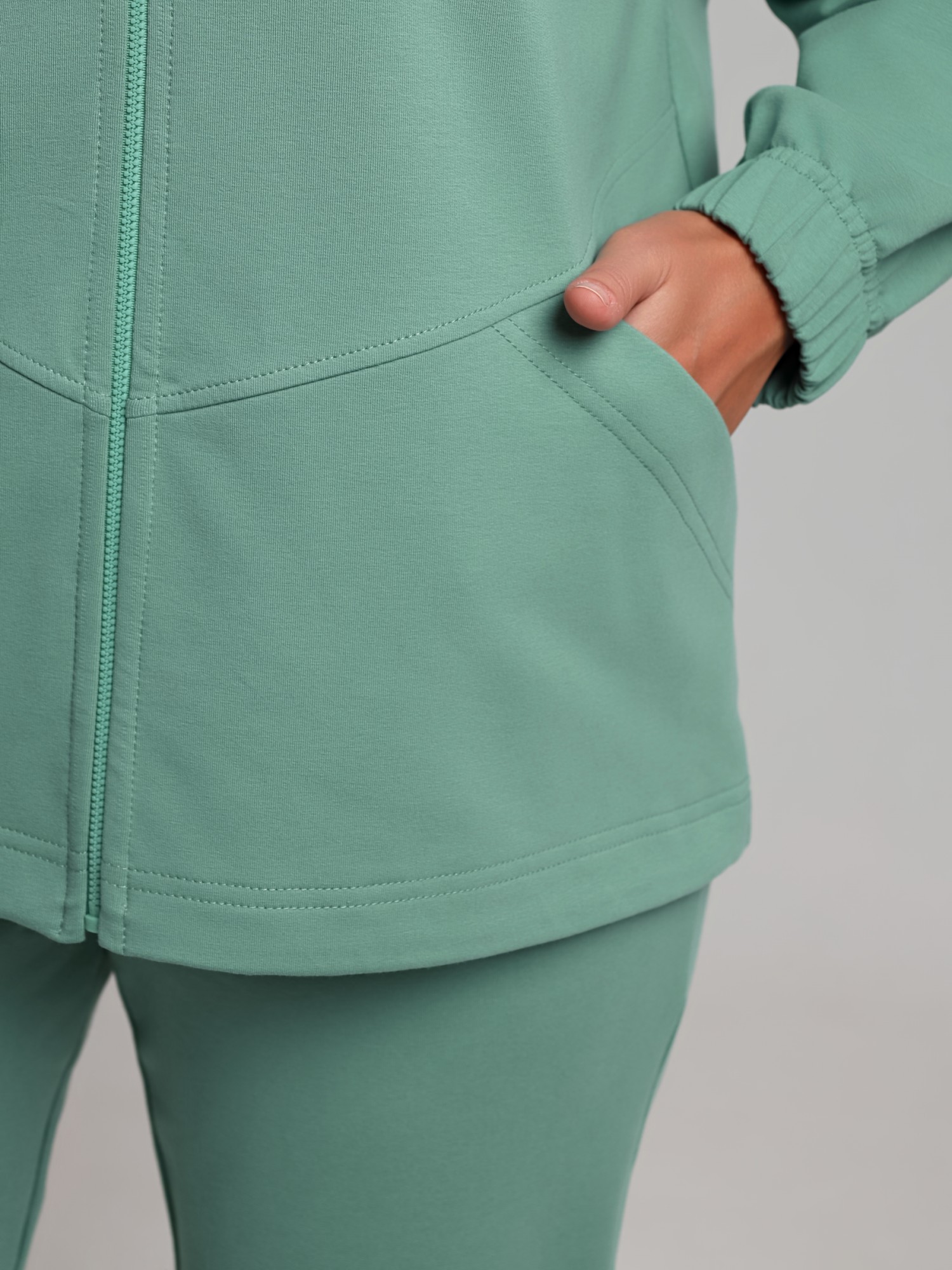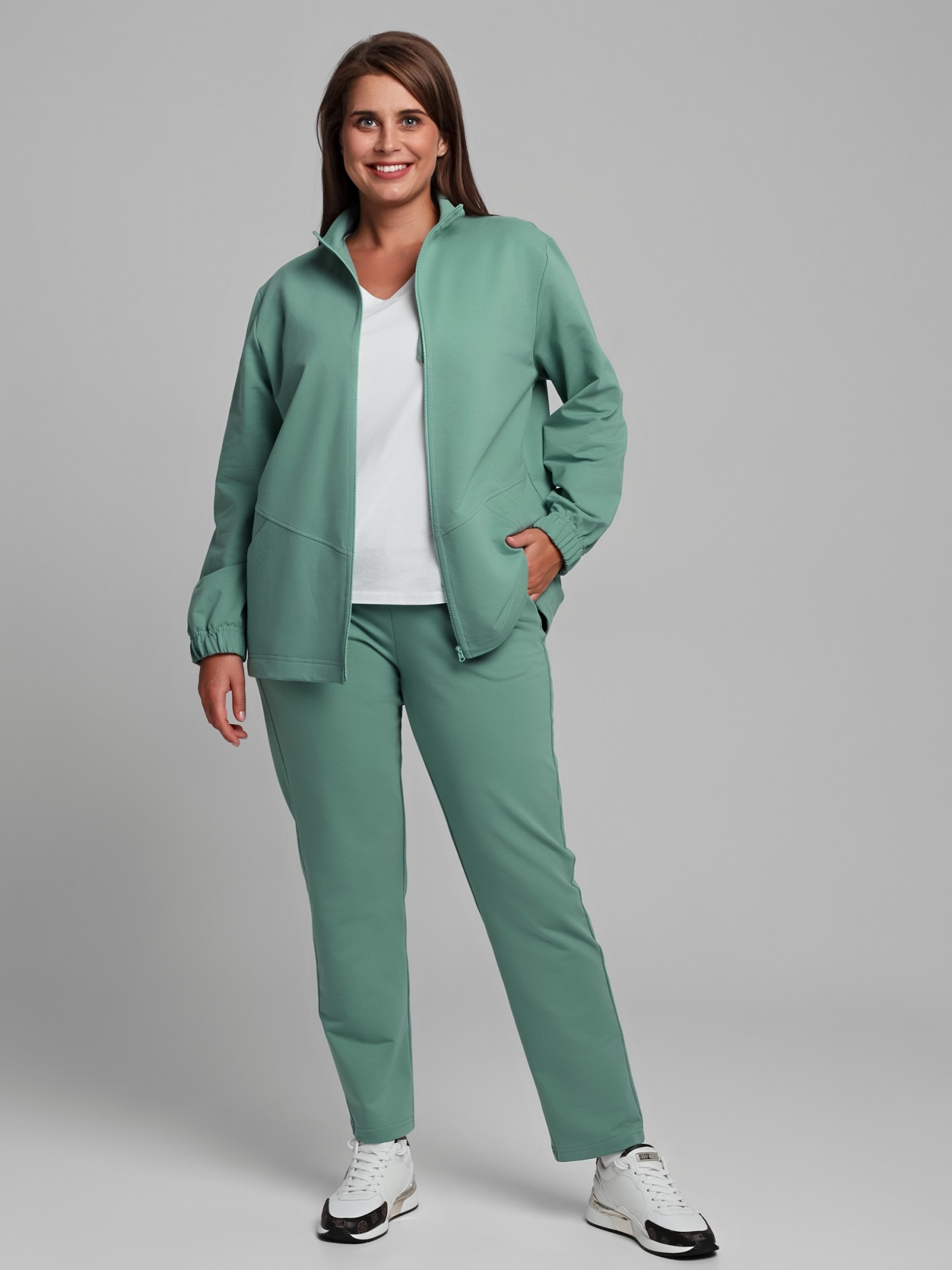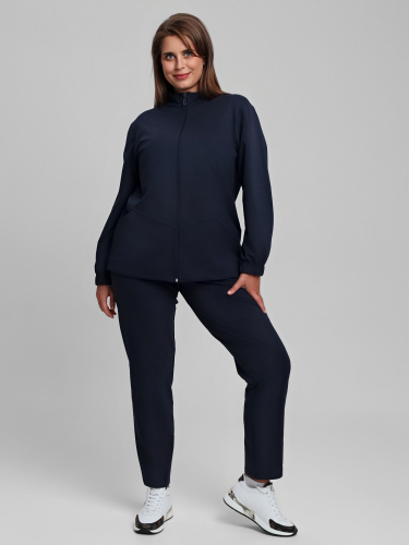 Костюм женский из трикотажного полотна «футер-двунитка» в единой цветовой гамме, состоящий из куртки и брюк. Куртка - прямого силуэта, свободная с длинными втачными рукавами, воротником «стойкой». Полочка состоит из двух частей соединенных по-косой, с накладными карманами и центральной бортовой застежкой на тесьму «молния». Низ рукавов обработан эластичной тесьмой, низ изделия с подгибкой с вложение эластичной тесьмы и регулируется по длине с помощью фиксаторов.Брюки - длинные, классического покроя, на притачном поясе с эластичной тесьмой внутри и карманами в боковых шва, на задних половинах обработаны две вытачки в области линии талии.