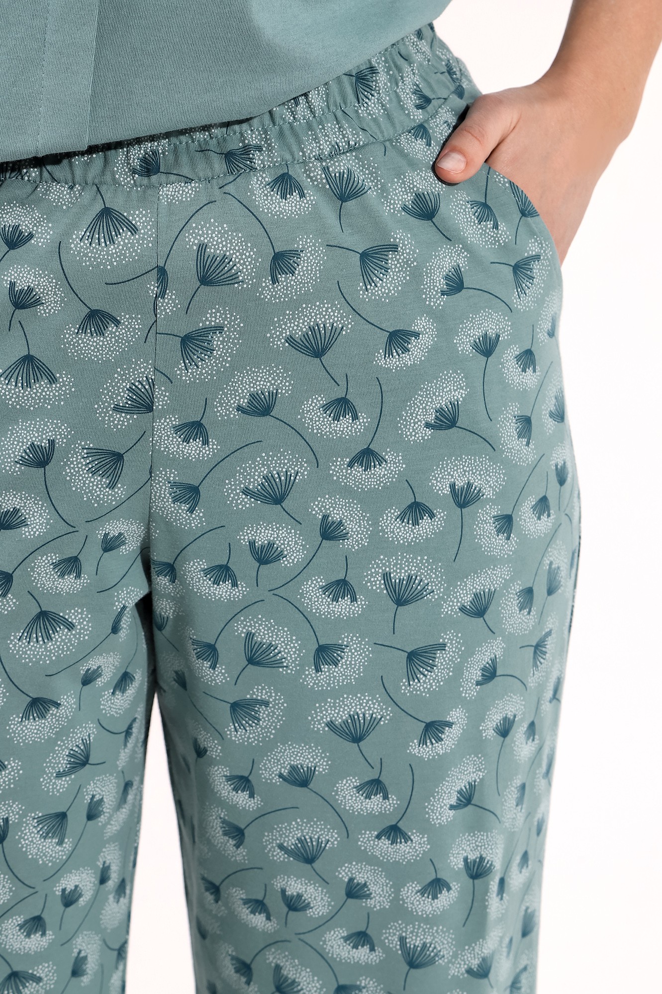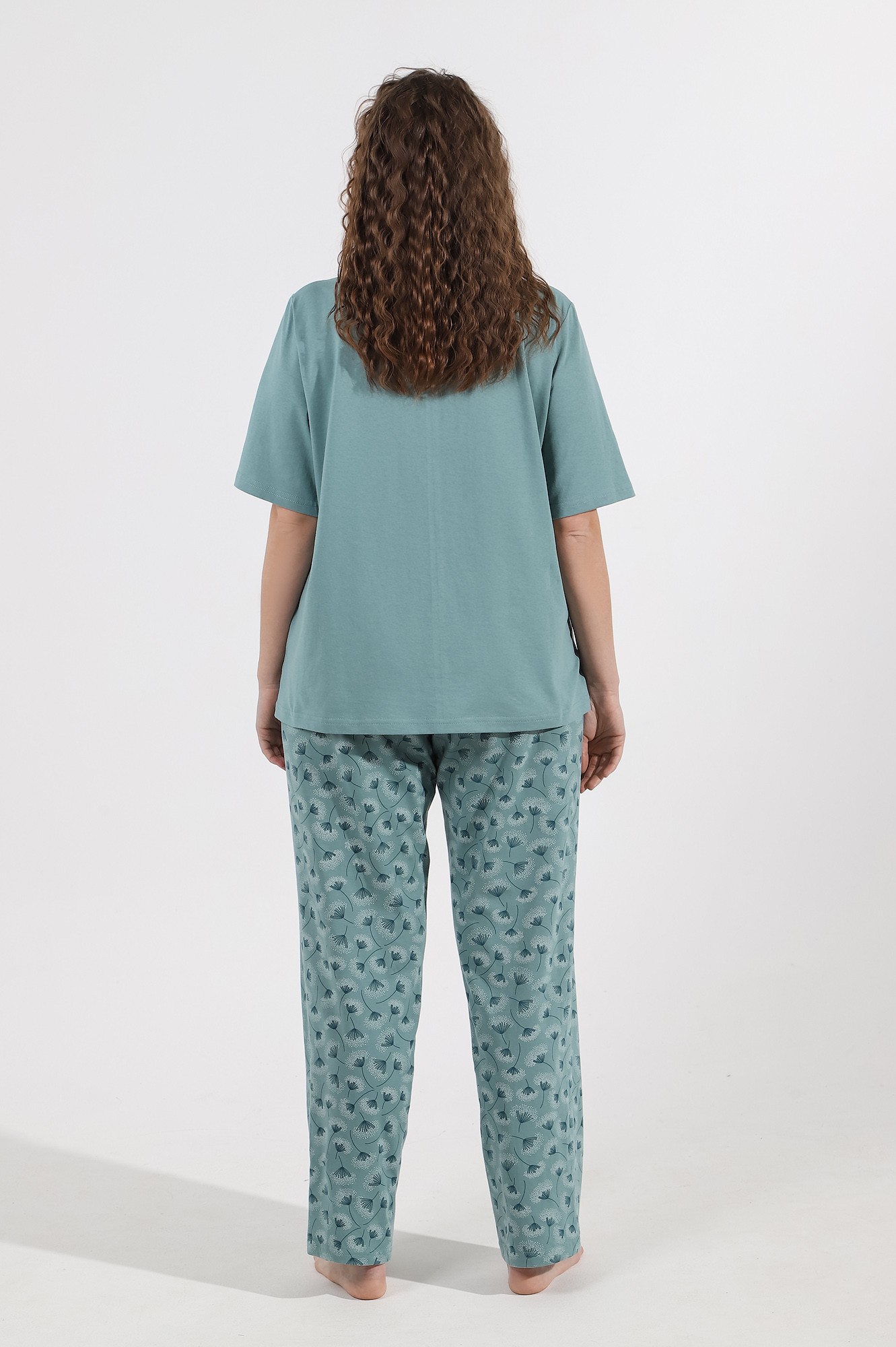 Костюм женский из трикотажного полотна «кулирка» в комбинации двух видов ткани гладкокрашеной и с набивным рисунком, состоящий из футболки и брюк. Футболка - из гладкокрашеного полотна, классического покроя, с короткими втачными рукавами, горловиной овальной формы, обработанной притачной бейкой. Перед – с застроченной складкой, расположенной по центру и имитирующей застежку на пуговицы.Брюки - из полотна с набивным рисунком, длинные, свободные, с карманами в боковых швах, на притачном поясе с эластичной тесьмой внутри.