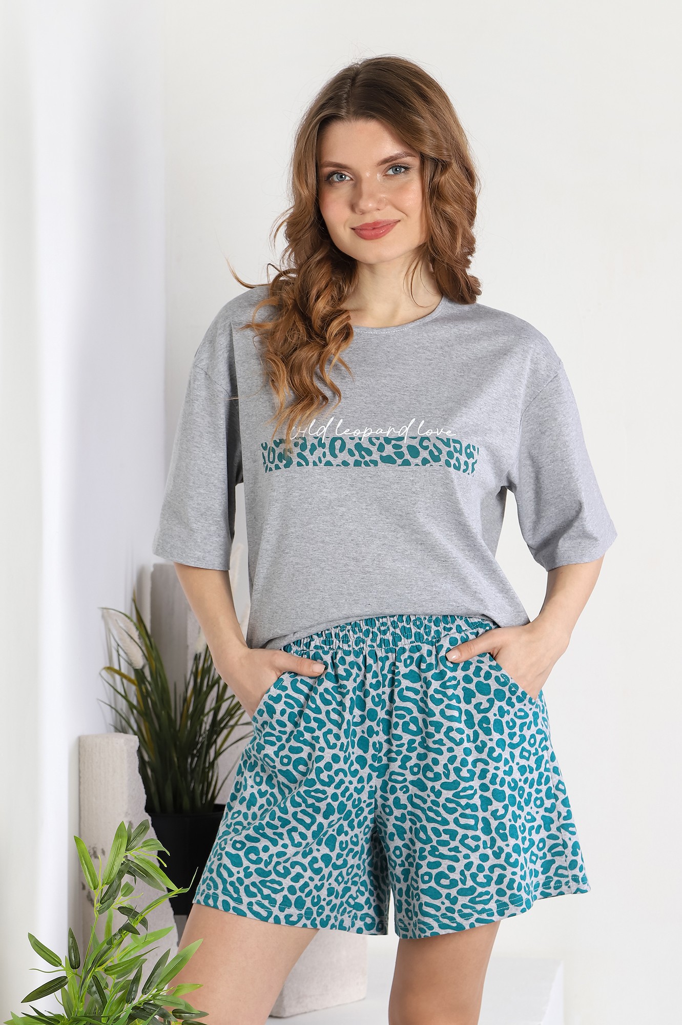 Костюм женский из трикотажного полотна «кулирка» в комбинации двух видов: с набивным рисунком и гладкокрашеного в единой цветовой гамме, состоящий из футболки и шорт. Футболка - из гладкокрашеного полотна, классического покроя, с короткими втачными рукавами, горловиной овальной формы, обработанной окантовкой из основного материала и принтом на полочке, выполненным в технике «шелкографии». Шорты – из полотна с набивным рисунком, свободные, с карманами в боковых швах, на притачном поясе с эластичной тесьмой внутри.