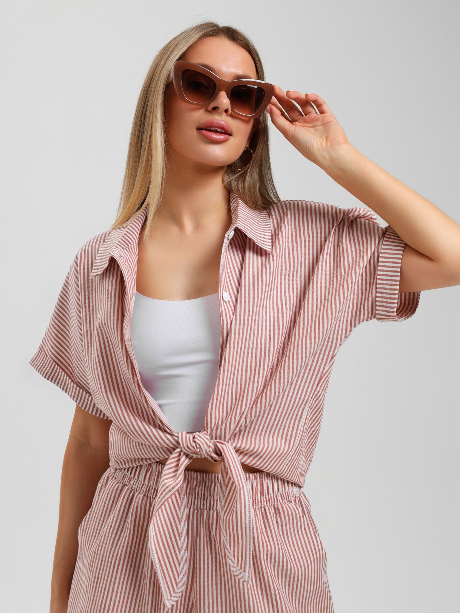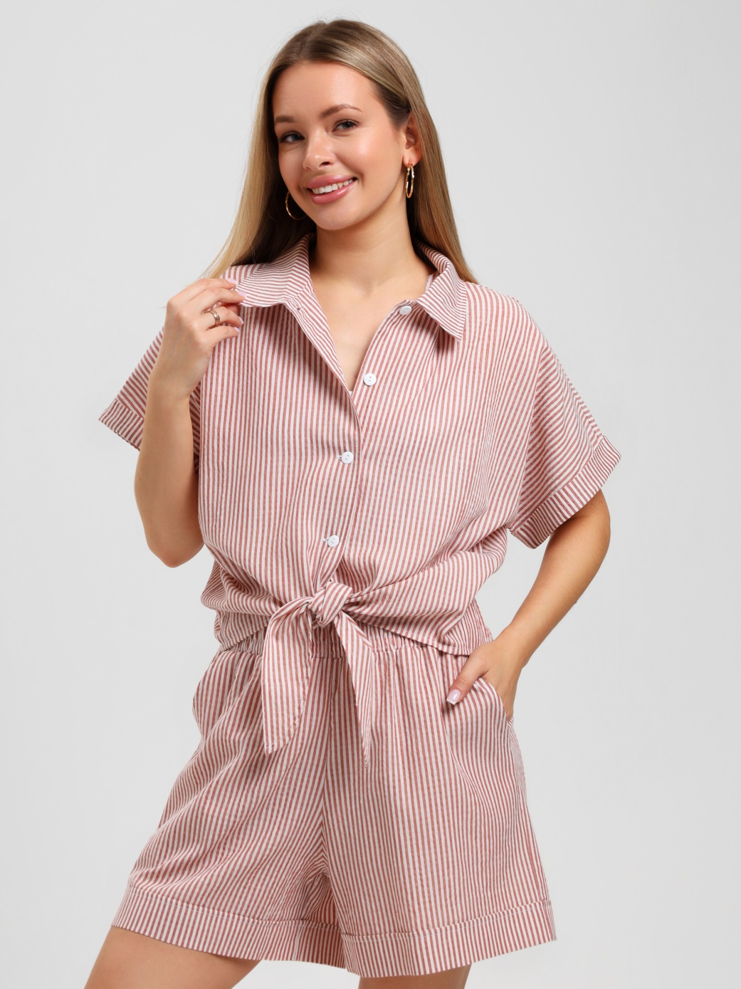 Костюм молодежный из тканого полотна в полоску, состоящий из блузы - рубашки и шорт. Блуза – укороченного силуэта, свободного покроя, с короткими цельнокроеными рукавами, обработанными манжетами, акцентными декоративными завязками спереди, отложным воротником и центральной бортовой застежкой на петли и пуговицы.Шорты - свободные, средней длины, с карманами в боковых швах, на притачном поясе с эластичной тесьмой внутри, с двойной подгибкой низа имитирующей манжет.