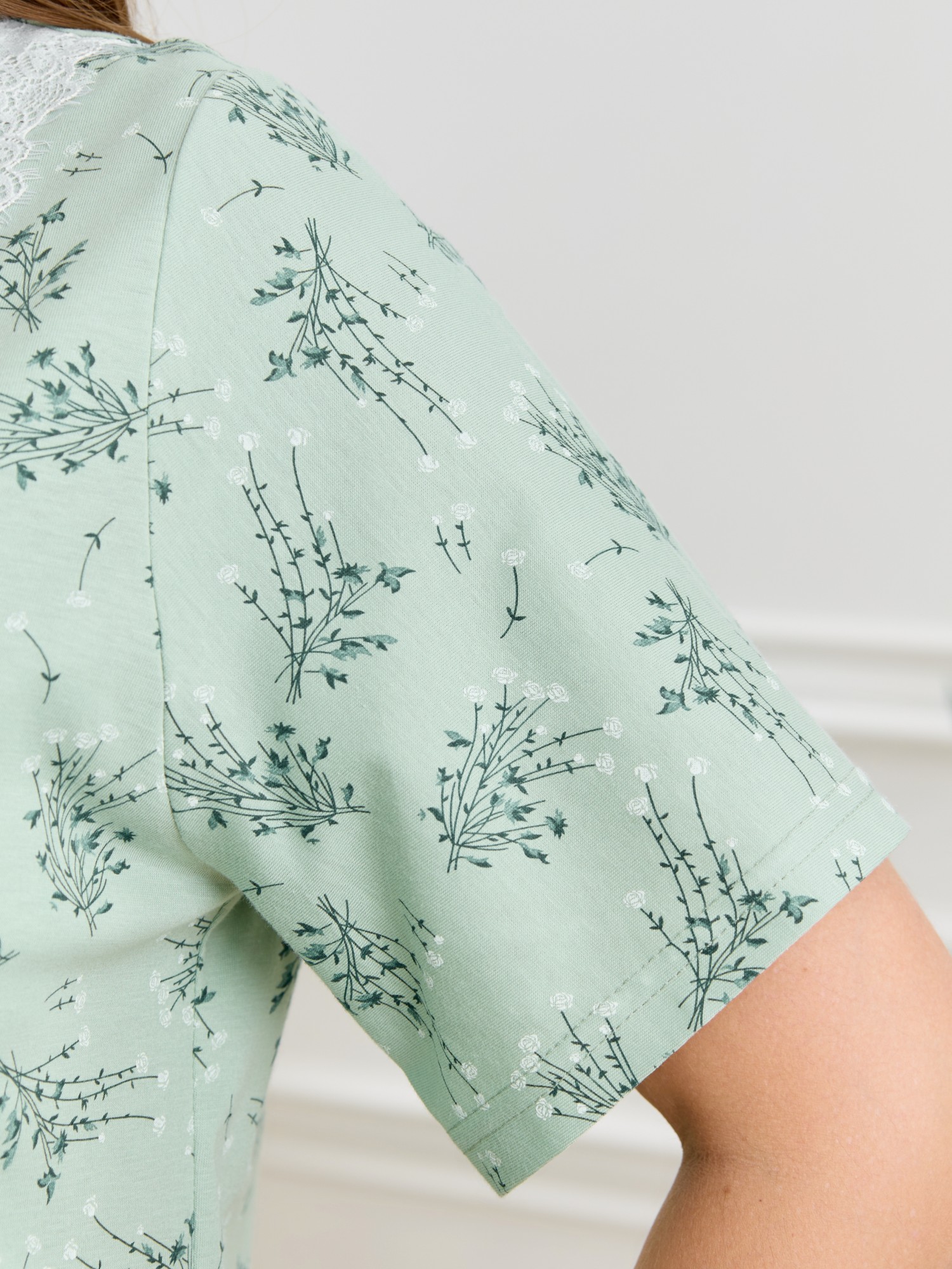 Сорочка женская из трикотажного полотна «кулирка» с набивным рисунком, полуприталенного силуэта, слегка расширенная к низу, с короткими втачными рукавами. Горловина V- образной формы, обработана кружевом с фестонным краем, по центру настрочен декоративный бантик из узкой атласной тесьмы.