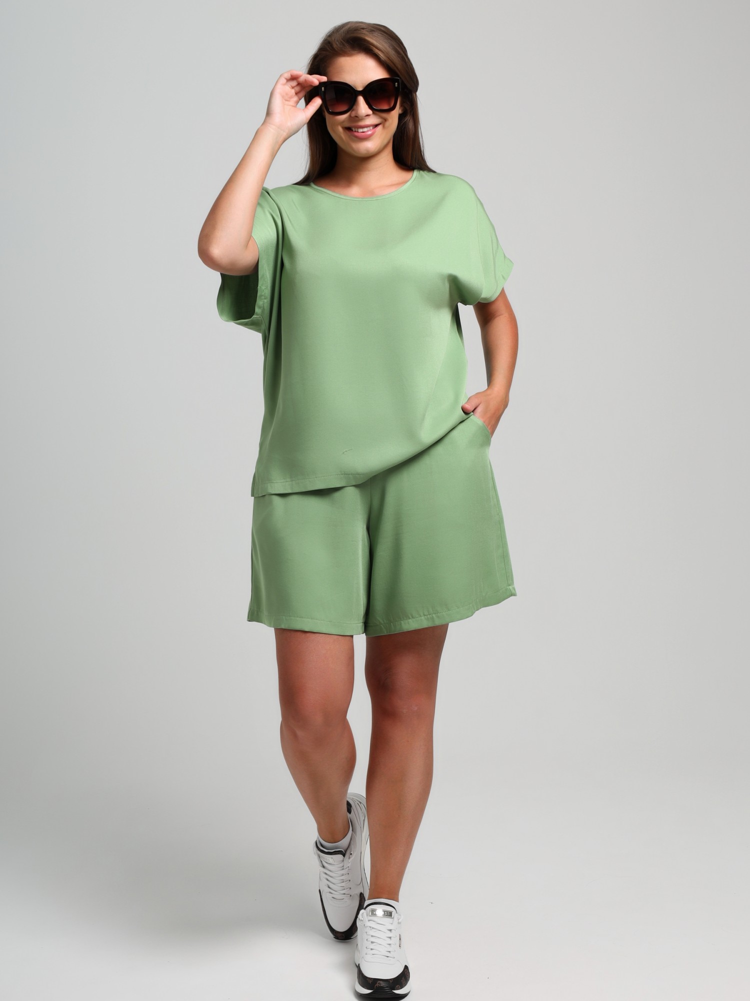 Шорты женские из гладкокрашеного тканого штапельного полотна, свободные, с карманами в боковых швах, на притачном поясе с эластичной тесьмой внутри. Средний шов передних половин обработан имитацией «гульфика»,