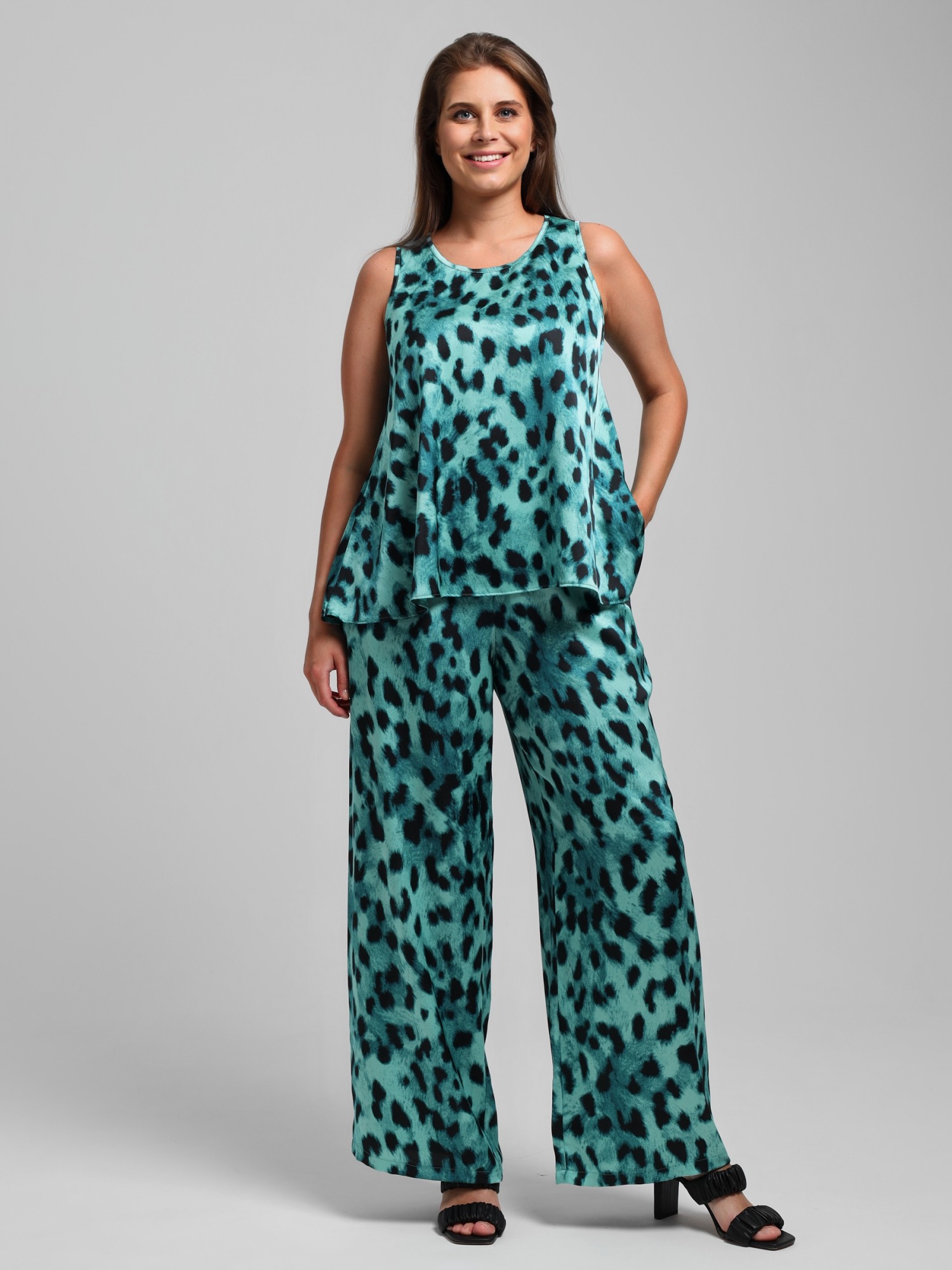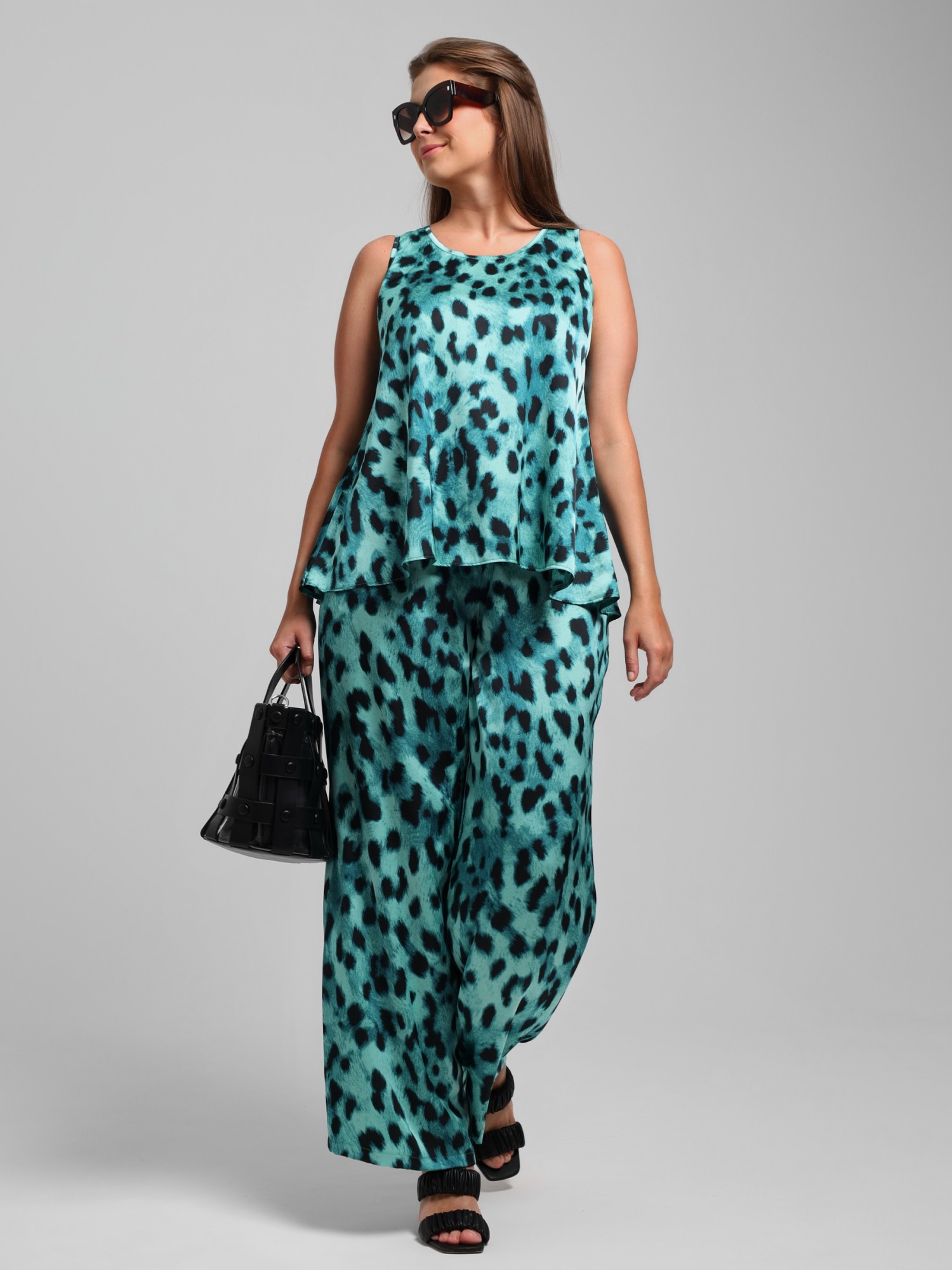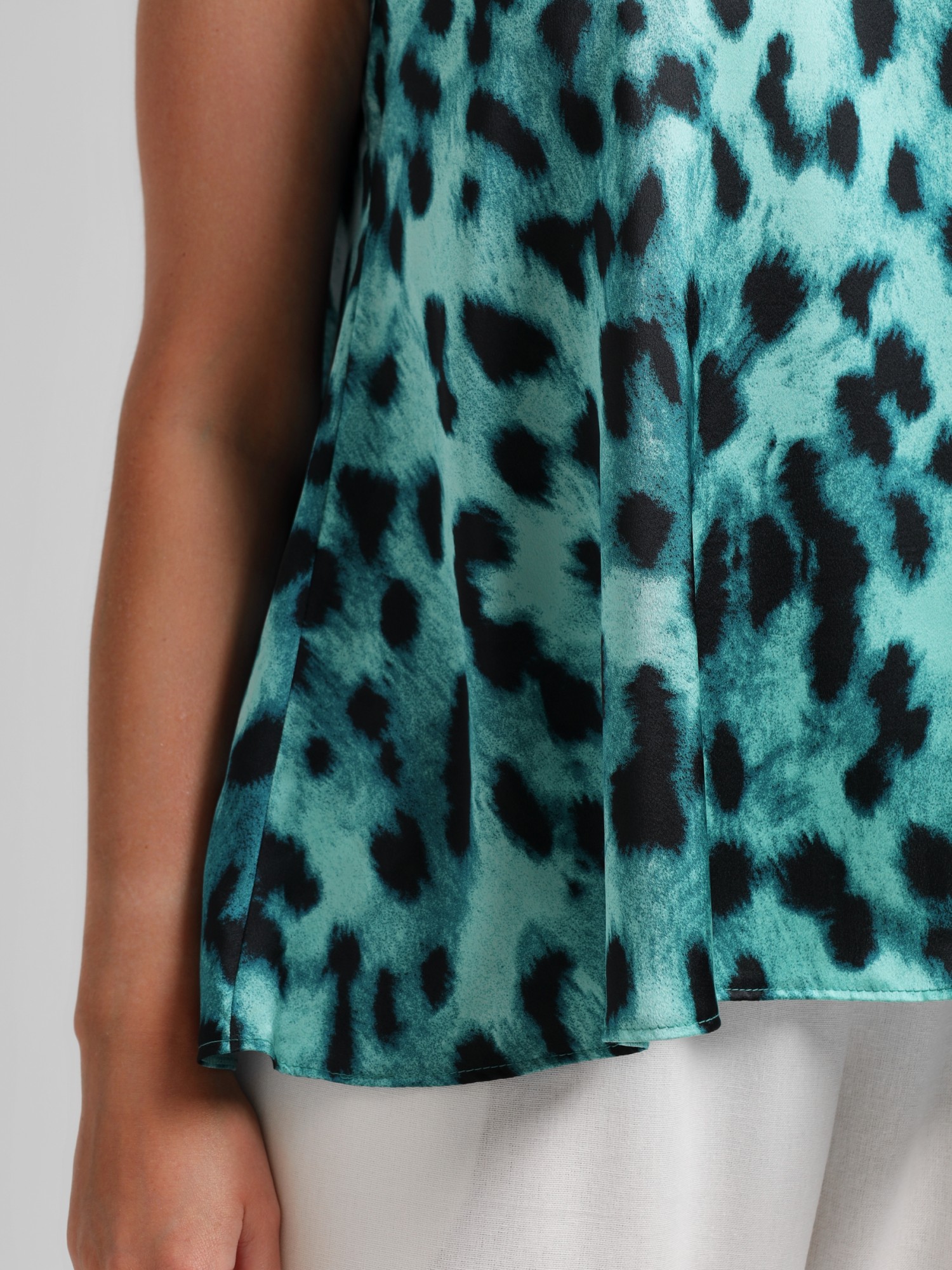 Блузка женская из тканого полотна «искусственный шёлк полиэстер» с набивным рисунком, расклешенного силуэта, без рукавов, с овальным вырезом горловины, окантованным основным материалом.