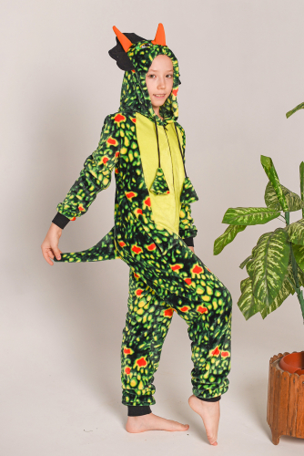 Комбинезон детский на молнии, верхняя часть изделия на подкладке, с капюшоном, стилизованный в виде животного – динозавра (трицератопса), двумя боковыми карманами в швах. Рукава втачные на манжете, на полочке вставка, имитирующая манишку. На капюшоне тематическая вышивка. Манишка выполнена из отделочной ткани, манжеты – из отделочной рибаны. В нижней части спинки дополнительная молния.
