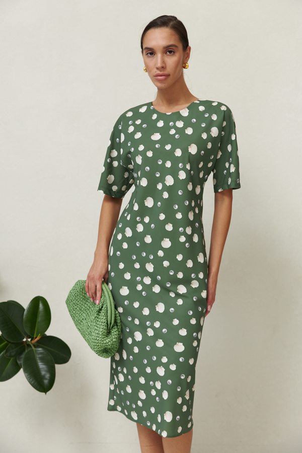 Платье прилегающего силуэта из плательной ткани. Крой платья по косой. Цельнокроеный короткий рукав. Круглый вырез горловины, сзади застёжка на петлю-пуговицу.