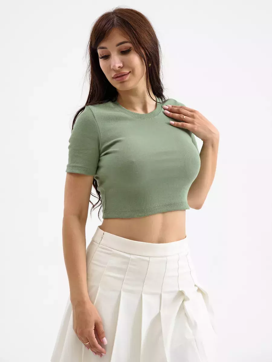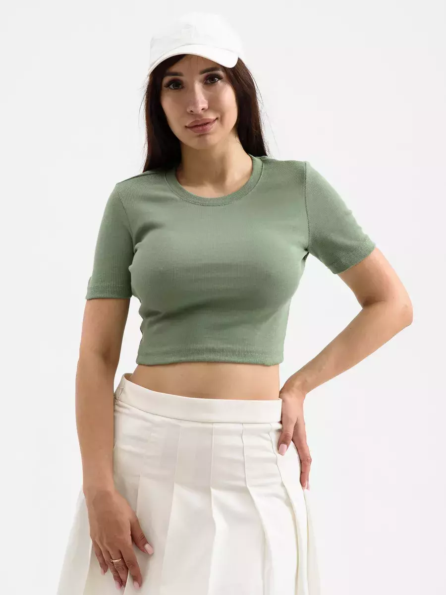 Футболка укороченная женская спортивного стиля, прилегающего силуэта- тренд сезона, выполнена из трикотажного х/б полотна с выработкой «рубчик» . Круглая горловина обработана бейкой из основного материала. Короткий втачной рукав.