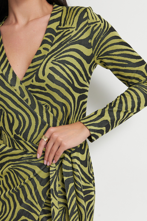 Платье прямого силуэта из эластичного полотна с жаккардовым анималистичным узором. Глубокий V-образный вырез горловины плавно переходит в запах, фиксируется притачным поясом. Втачной длинный рукав.